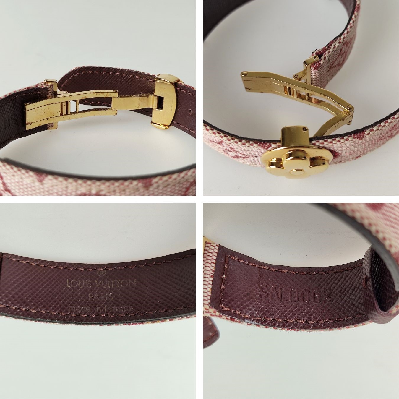 Louis Vuitton MODELL: Goodluck Armband aus burgunderfarbenem Segeltuch. Innenfutter aus Rindsleder. Schnappverschluss aus goldenem Metall. Mit Karton und Etiketten. HERGESTELLT IN: Frankreich – STEMPEL: SN0062 ABMESSUNGEN: Durchmesser 7 cm ZUSTAND: Ausgezeichnet Nicht wahrnehmbare Oxidationsflecken auf dem Verschluss, die mit bloßem Auge nicht sichtbar sind.