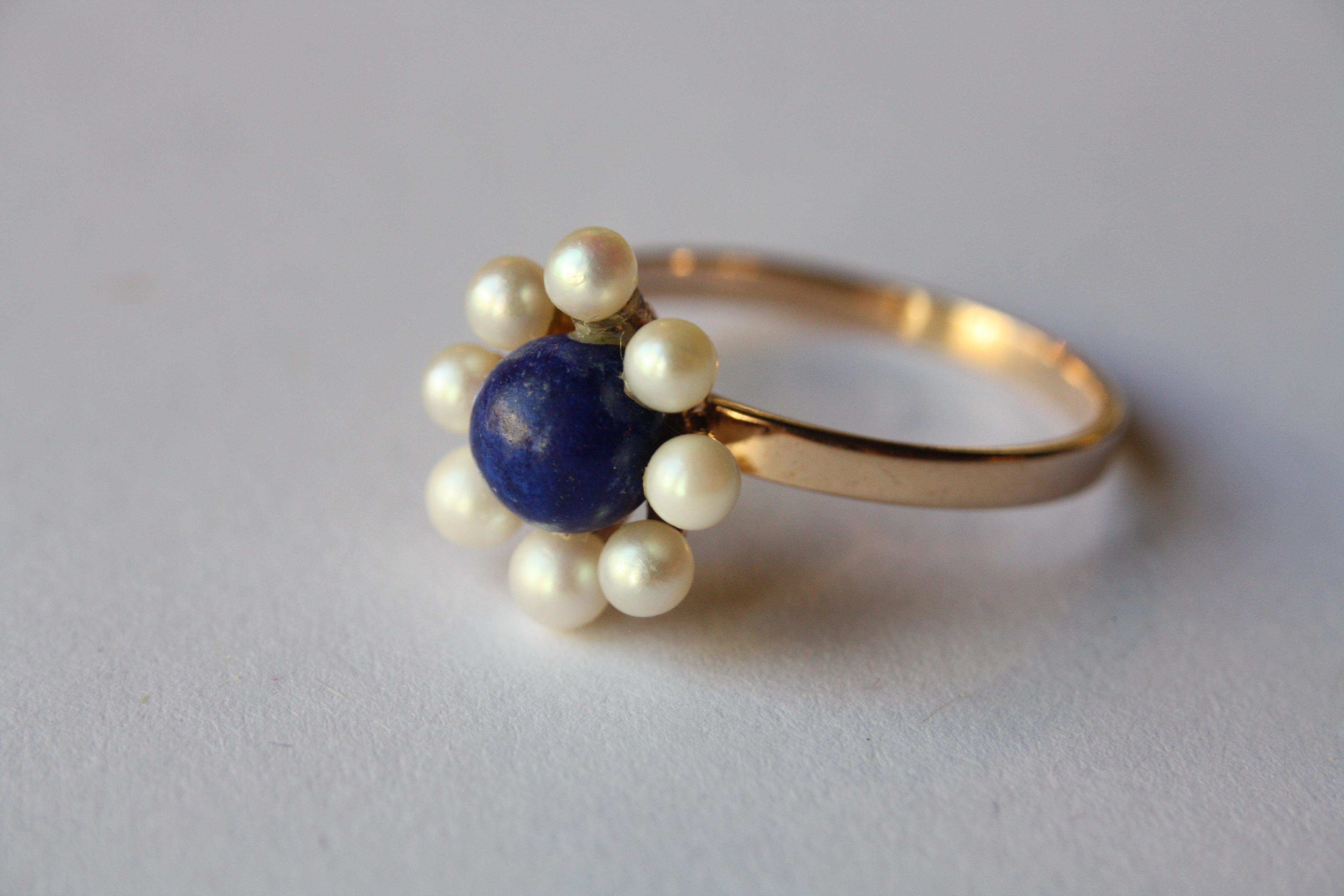 Ring "Krone" verziert mit blauem Zierstein und weißen Zuchtperlen Gewicht 2,8 g TDD 53