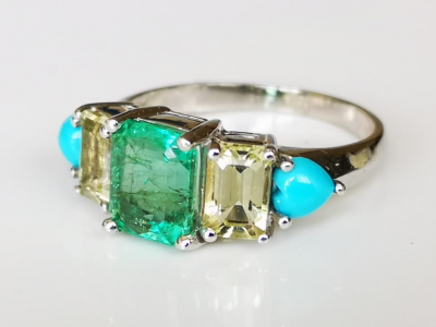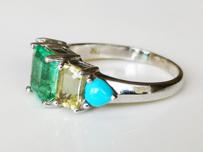 Ring aus 18 Karat Weißgold (750/1000) in Form eines Binsen, der in seiner Mitte mit einem rechteckigen Smaragd von 1,35 Karat mit gelben Beryllen und Türkis verziert ist.