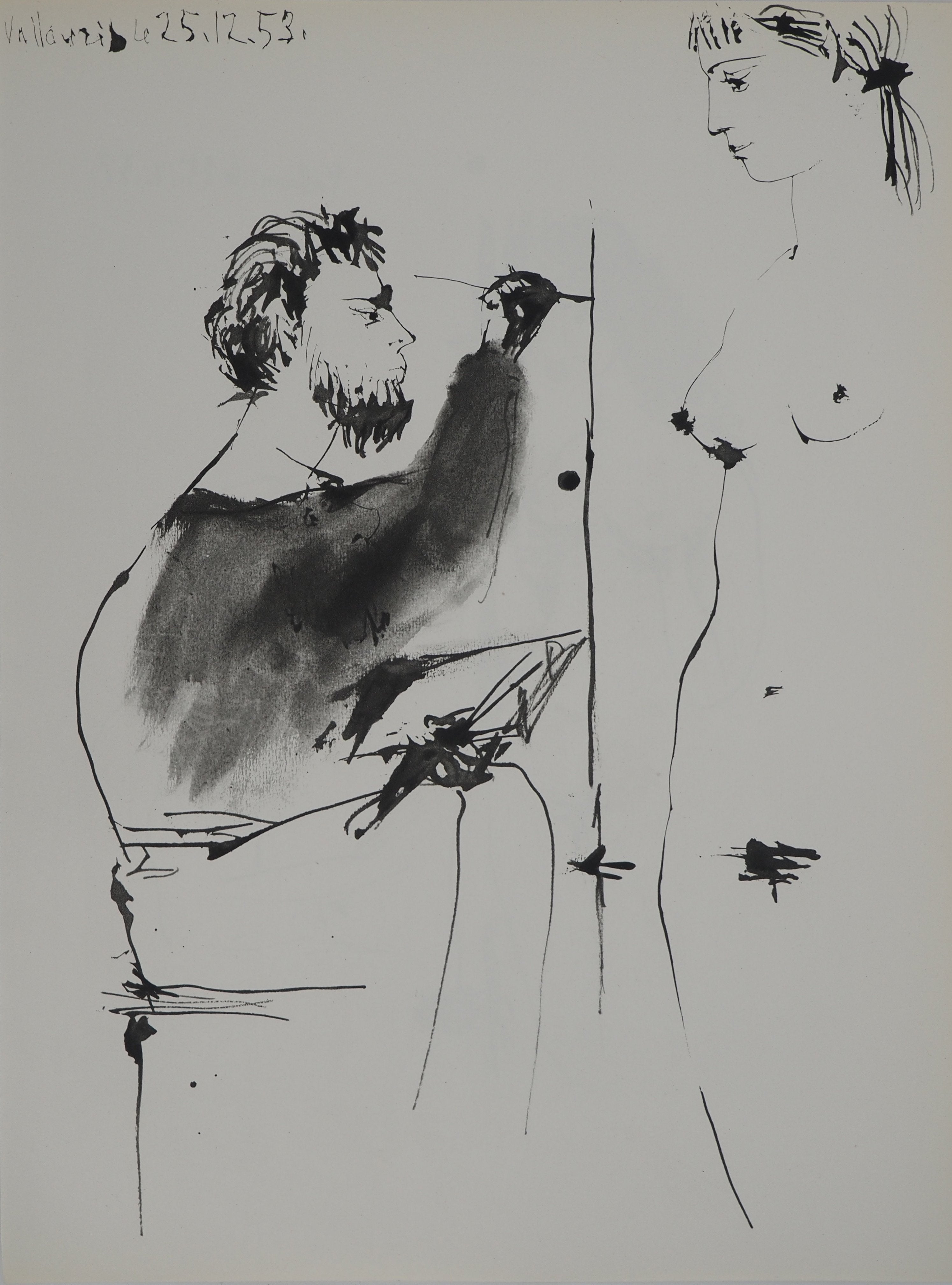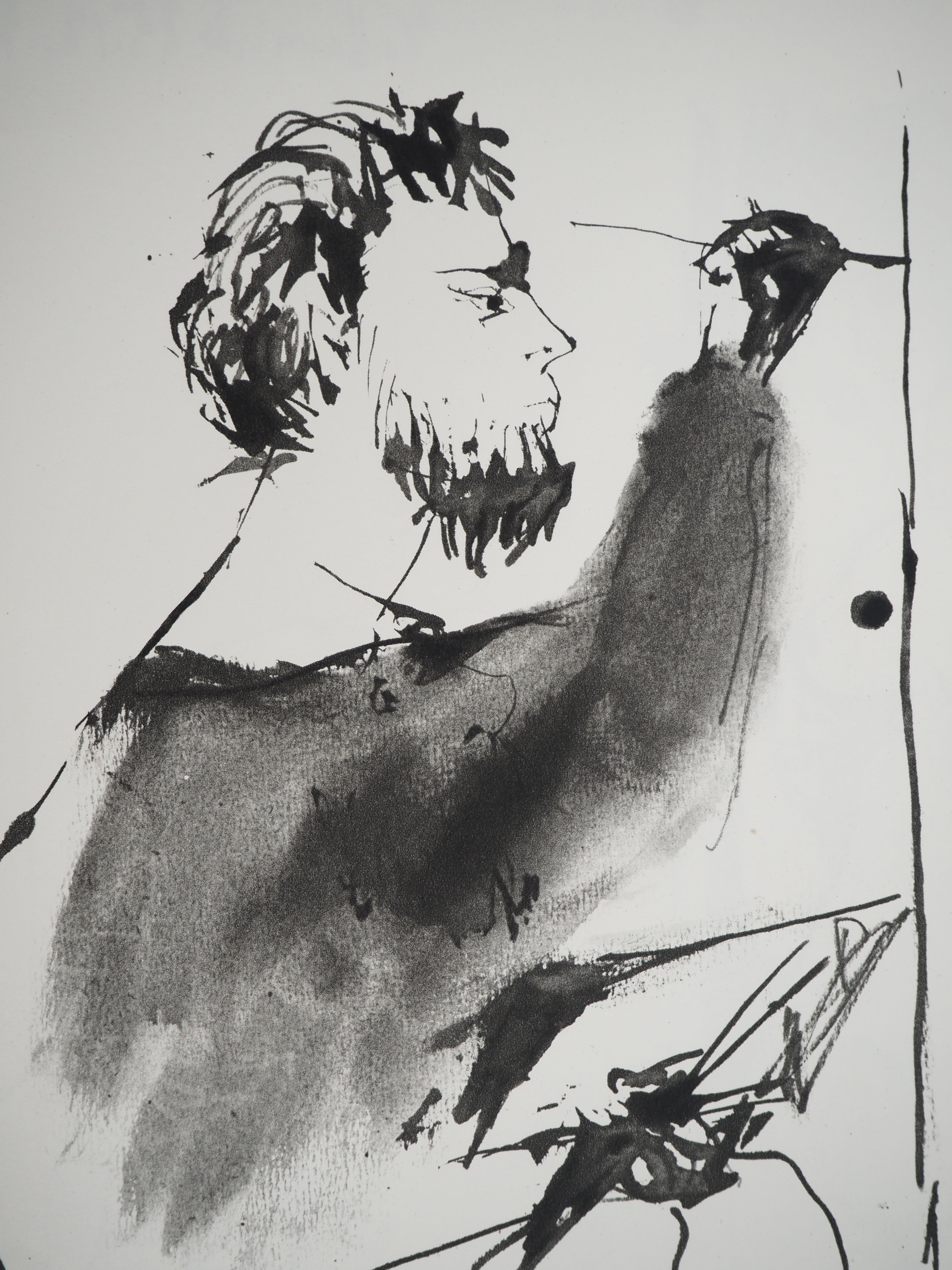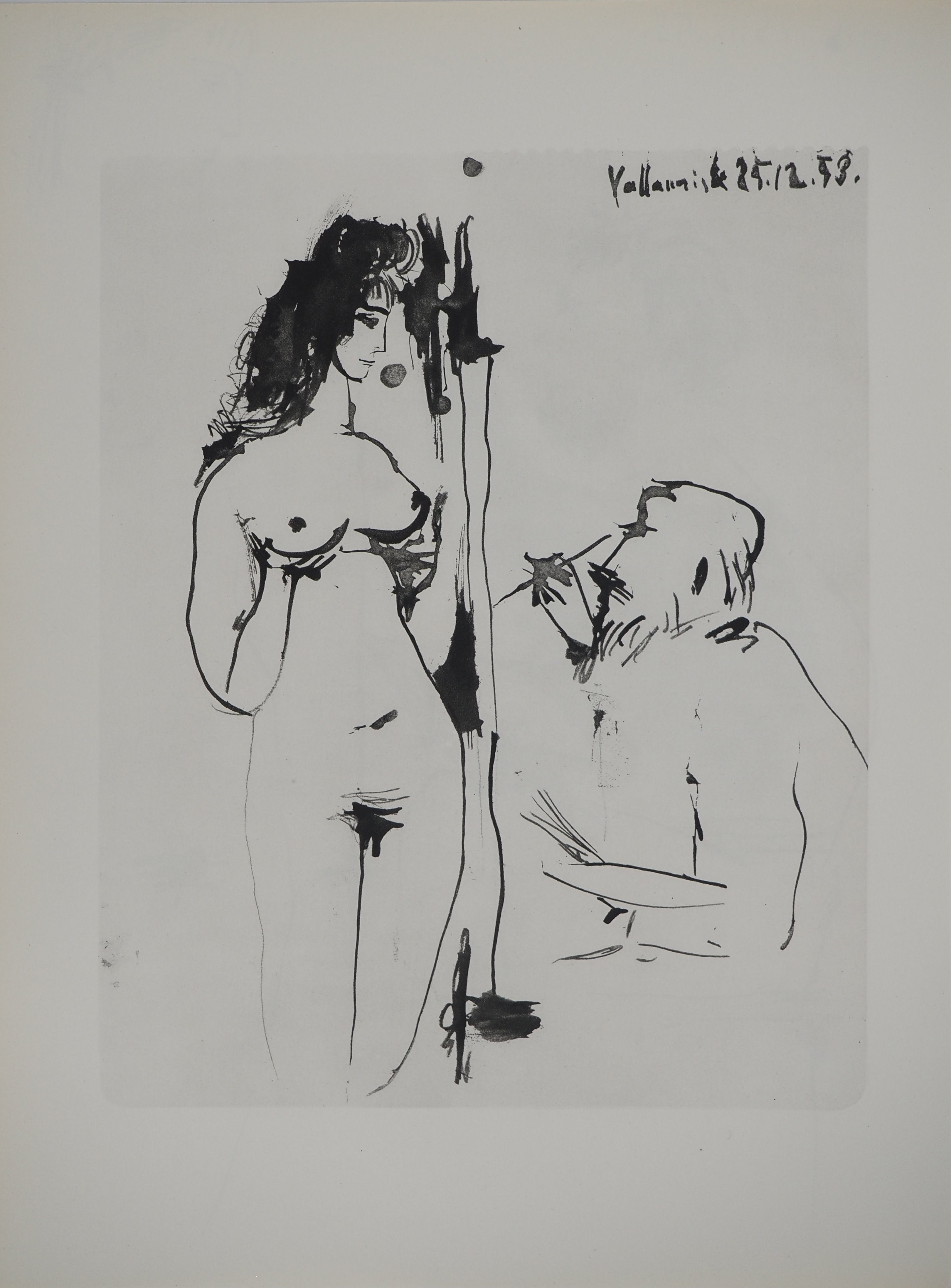 INFORMATION : Editée dans le portfolio Verve n° 29-30 : "La comédie humaine", reprenant un ensemble de dessins de Picasso réalisés entre décembre 1953 et février 1954, pendant une période de création intense. Les sujets de l'artiste en vieil homme et de l'artiste avec son modèle sont centraux dans la « Comédie humaine » mise en scène par Picasso et font écho à ses préoccupations stylistiques tardives.
