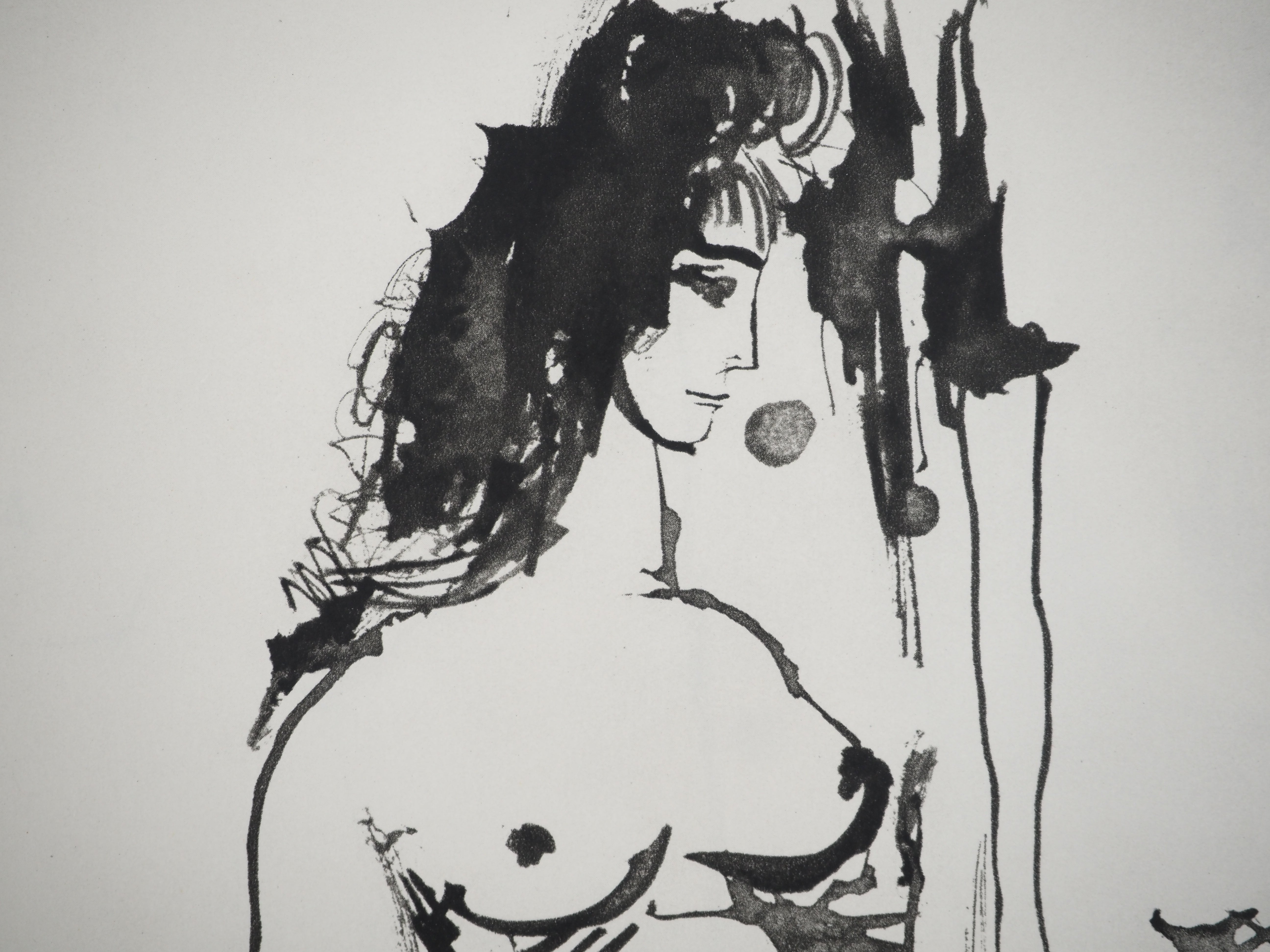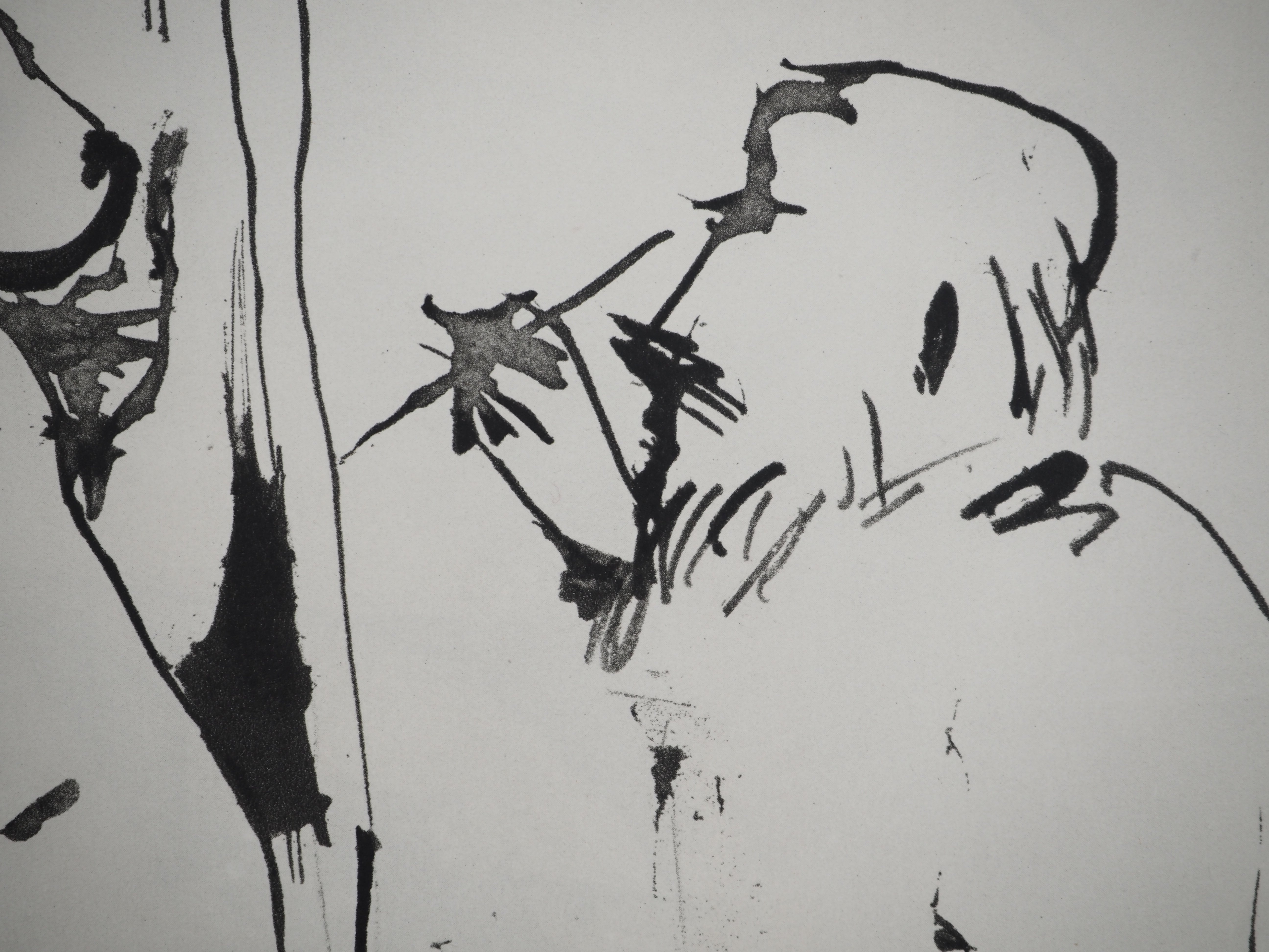 Pablo PICASSO (1881-1973) Das sinnliche Porträt, 1954 Heliogravüre (Draeger-Werkstatt) Ohne Vorzeichen Auf der Platte datiert Auf dickem Papier 35,5 x 26,5 cm Zweite Abbildung auf der Rückseite (siehe Fotos 4, 5, 6) INFORMATIONEN: Veröffentlicht im Verve-Portfolio Nr. 29-30: „Die menschliche Komödie“, mit einer Reihe von Zeichnungen Picassos, die zwischen Dezember 1953 und Februar 1954, während einer Zeit intensiven Schaffens, angefertigt wurden. Die Themen des Künstlers als alter Mann und des Künstlers mit seinem Modell stehen im Mittelpunkt der von Picasso inszenierten „Menschenkomödie“ und spiegeln seine späten stilistischen Anliegen wider. Ausgezeichneter Zustand
