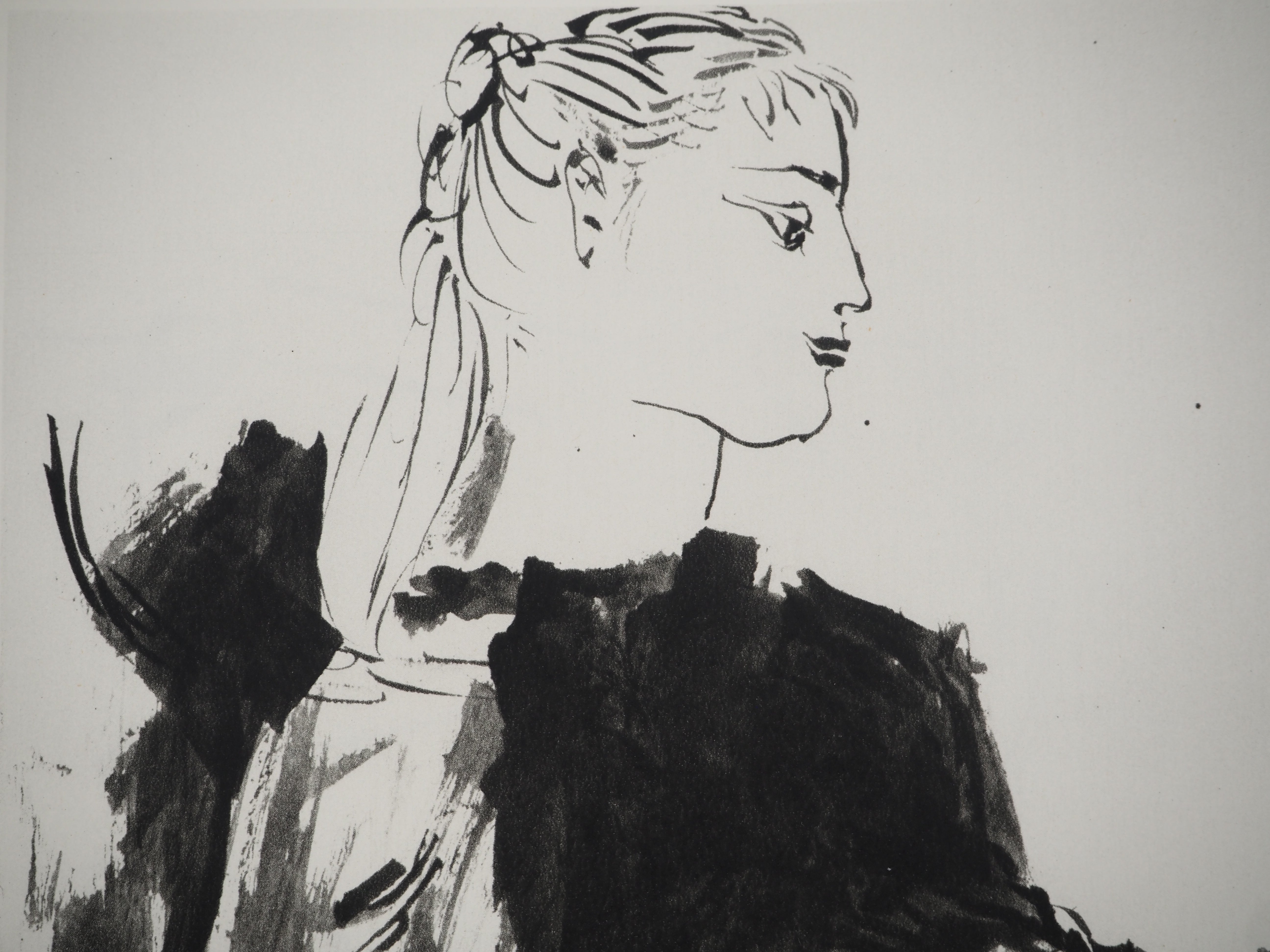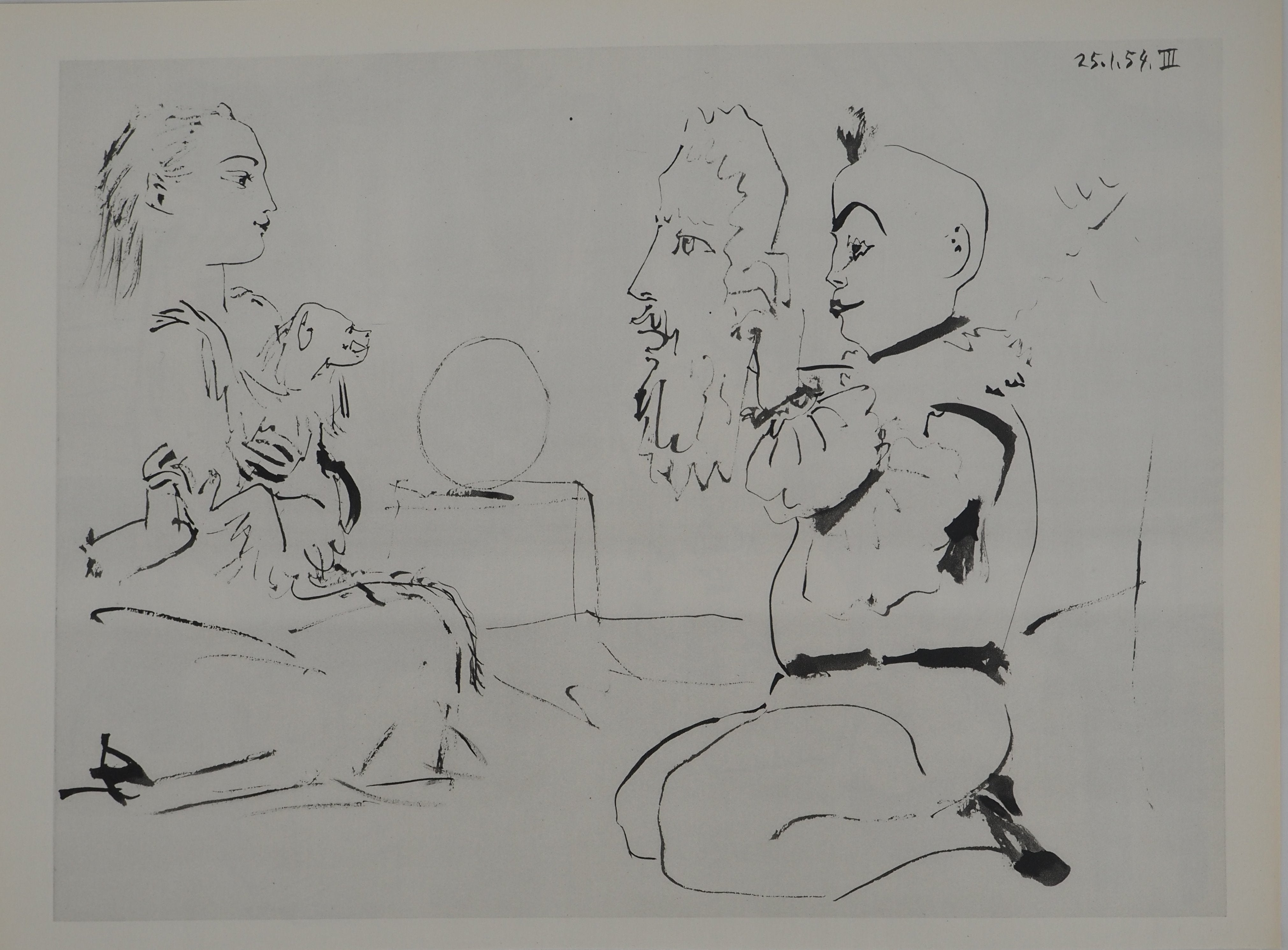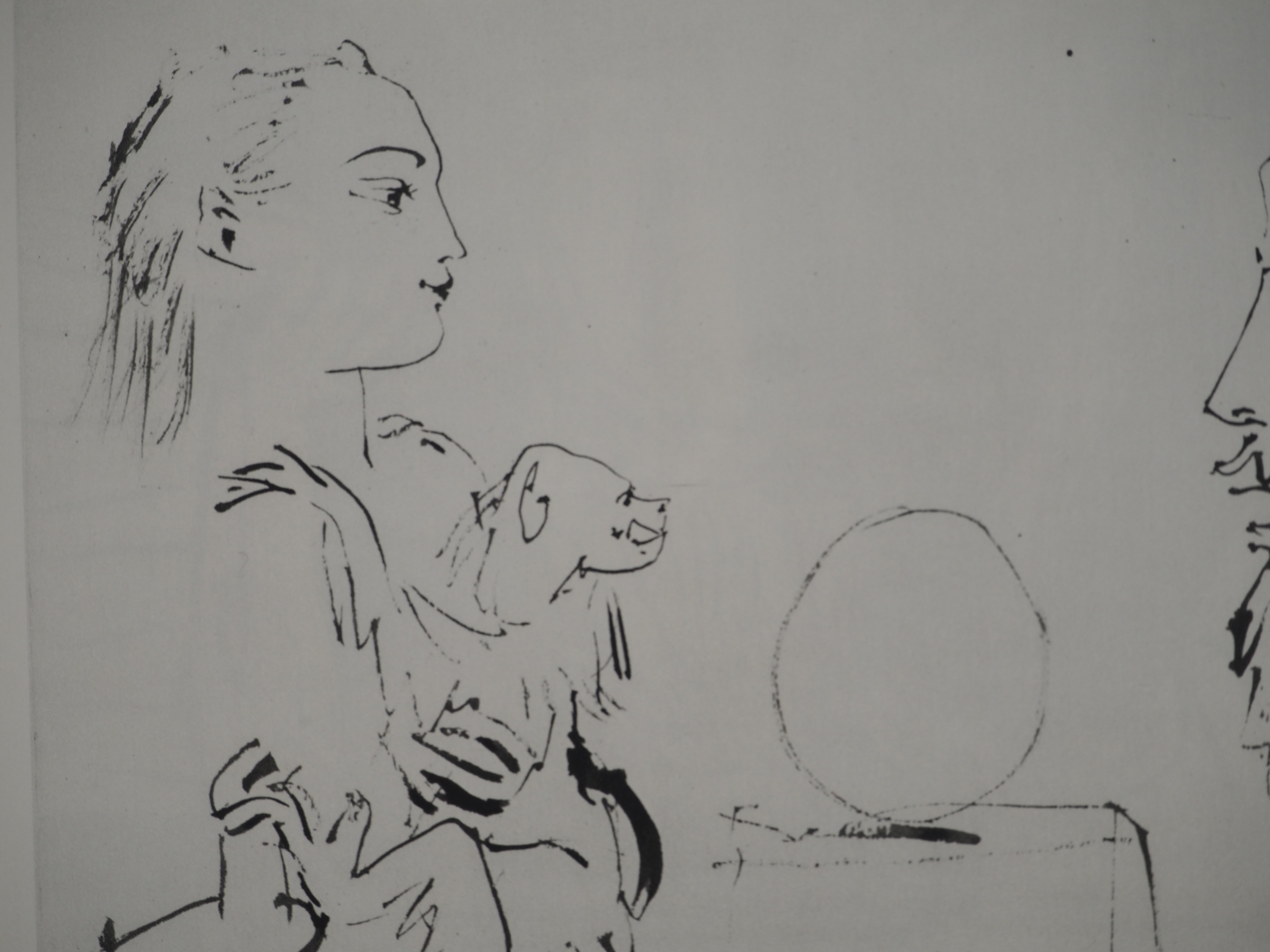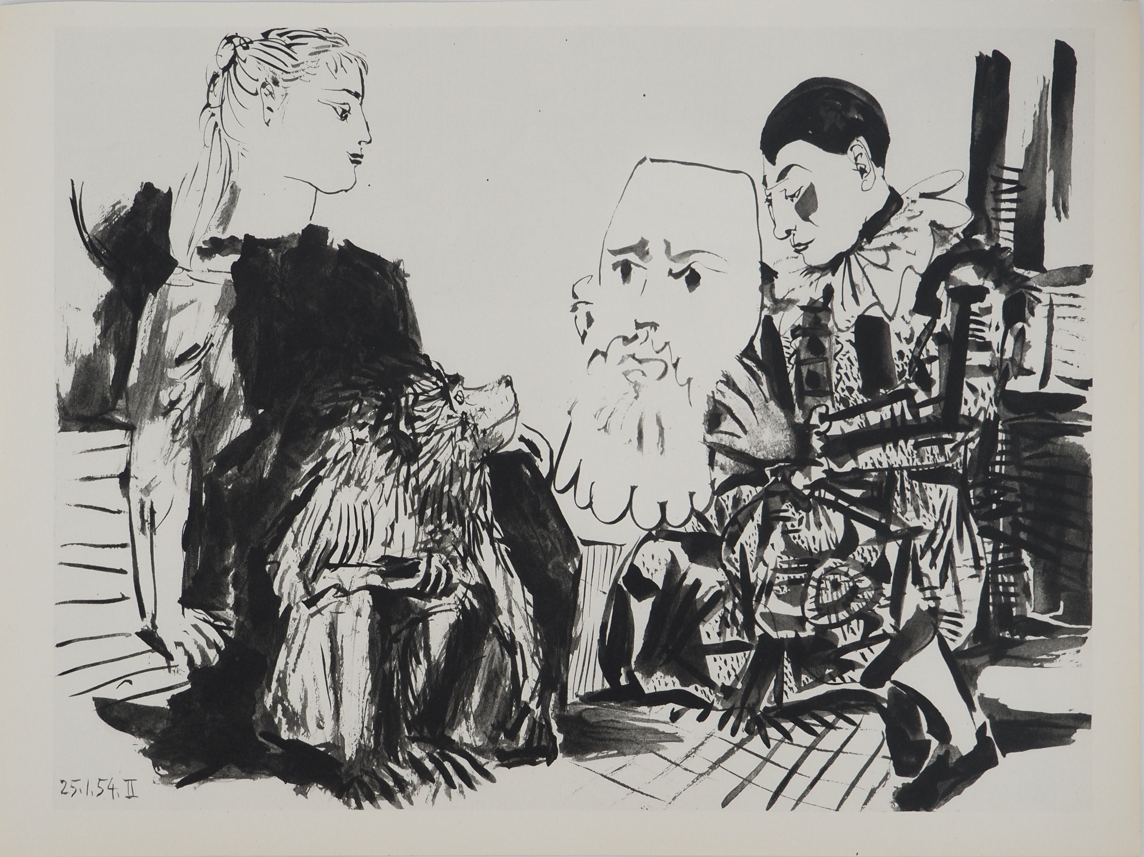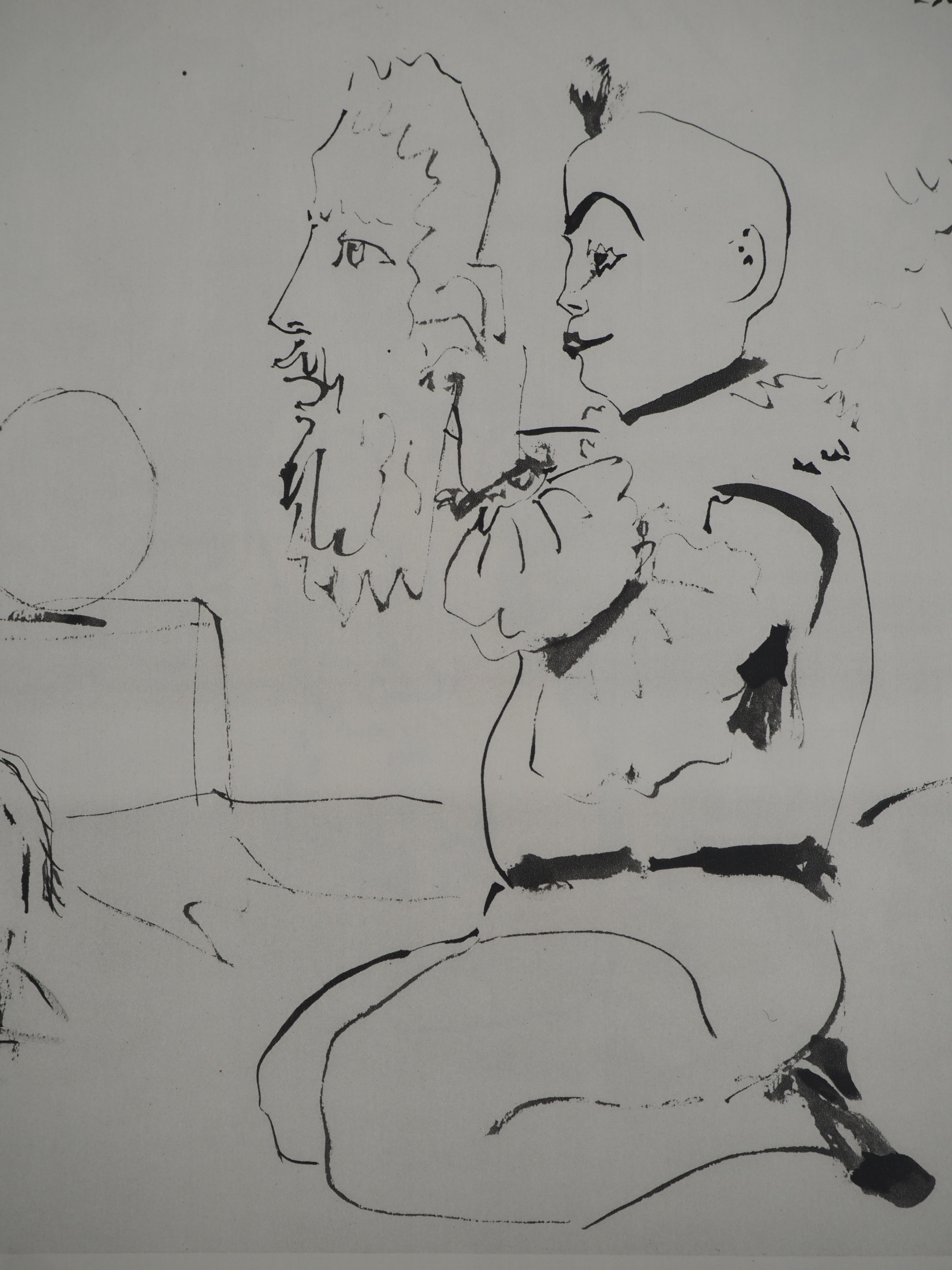 INFORMATION : Editée dans le portfolio Verve n° 29-30 : "La comédie humaine", reprenant un ensemble de dessins de Picasso réalisés entre décembre 1953 et février 1954, pendant une période de création intense. Les sujets de l'artiste en vieil homme et de l'artiste avec son modèle sont centraux dans la « Comédie humaine » mise en scène par Picasso et font écho à ses préoccupations stylistiques tardives.