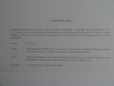 Lithographie hergestellt unter der Kontrolle des Nachfolge Magritte, beglaubigt durch den Blindstempel Nachfolge und handsignierte Beglaubigung durch den Präsidenten der Nachfolge.