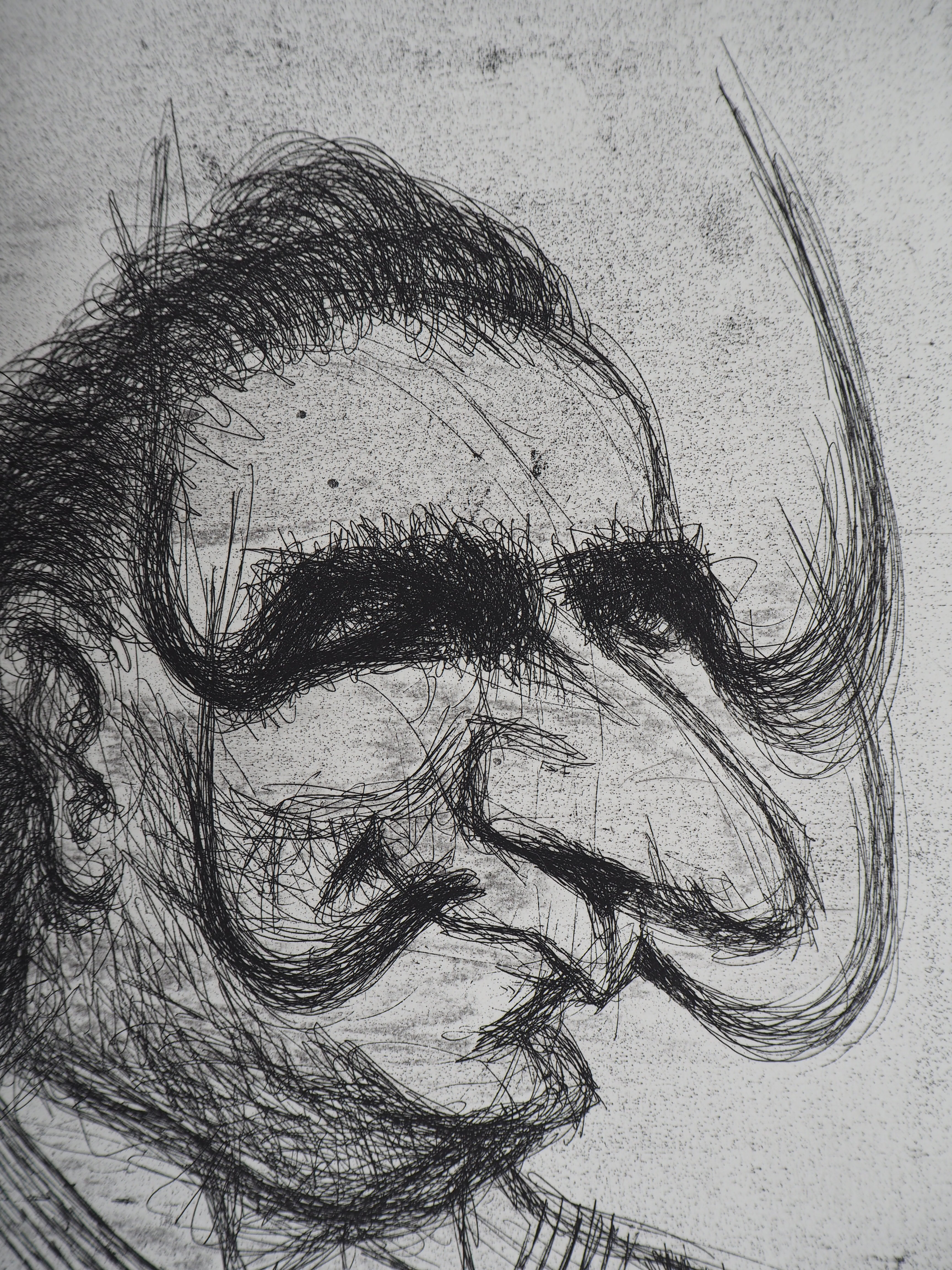 Informations : Gravure réalisée par Tim, caricaturant Dali, pour l'ouvrage qu'ils ont illustré en commun (Dali ayant produit une magnifique gravure à l'eau forte figurant un évêque déclenchant