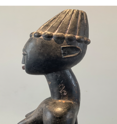 Die Figur einer weiblichen Koulango-Ahnin mit gestrecktem Hals, hervorstehendem Nabel, Skarifikationen an Brust und Brust erinnert an die matrilineare Linie Koulango oder Pakhella der Dioula,