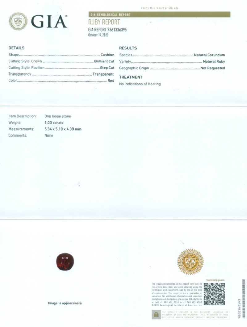1,03 ct. TAUBENBLUT-Rubin - MOSAMBIK: GIA-zertifiziert Kt. Gewicht - 1,03 ct. Schnitt - Cushion Brilliant Step-Schnitt Farbe Rot Klarheit - VVS Abmessungen - 5,34 x 5,10 x 4,38 mm Herkunft - MOSAMBIK Behandlung - Keine Anzeichen von Erwärmung. GIA-Bericht Nr. - 7361336395