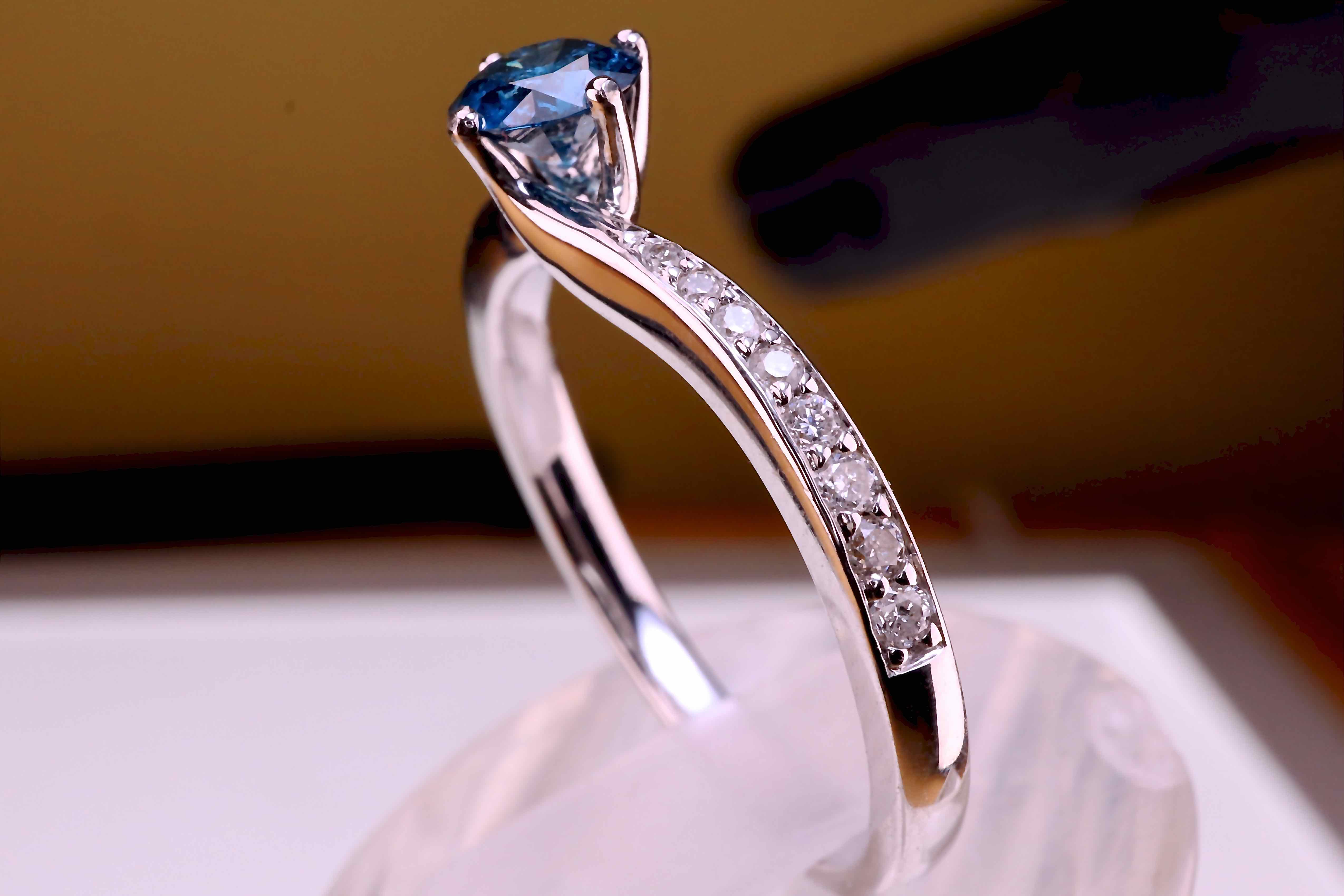 Exceptionnel et rare Diamant central naturel bleu « fancy deep blue » de taille « brillant » parfaite de 0,28.5 carat certifié ALGT (Anvers) sur Bague alliance moderne en or blanc 18 kt avec 2