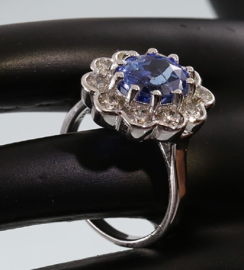 Weißgold Blauer Saphir (IGI-zertifiziert) & Diamantring: 14 K / 585 14 K Weißstempel Gold Bruttometallgewicht - 5,750 g Abmessungen - 18 mm x 15 mm Gesamtgewicht des Edelsteins - 4,94 ct. Ringgröße - EU 54 - US 7 Blauer Saphir Details (IGI-zertifiziert) Karat Gew. - 3,83 ct. Schnitt - Ovaler Mischschnitt Farbe - Blauviolett Klarheit - VS Abmessungen - 9,62 x 7,55 x 6,17 mm Behandlung - Natürliche Saphire werden häufig verbessert. Vorgeschlagene Herkunft - Madagaskar IGI-Zertifikat Nr. - 239678811 Diamant Details Gewicht - 1,11 ct. Farbe braun Klarheit - SI Schnitt - gut Form - runde Brillanten Gesamt-Nr. von Diamanten - 10 Behandlung - Keine