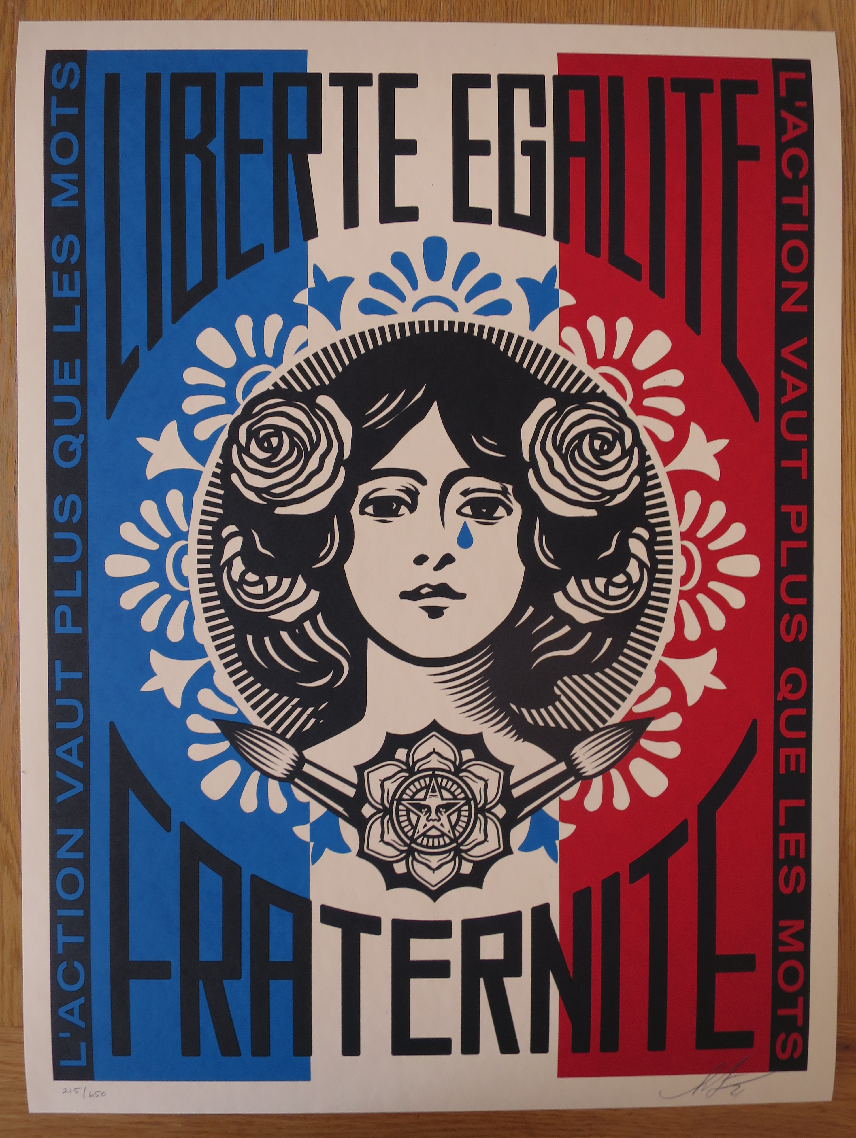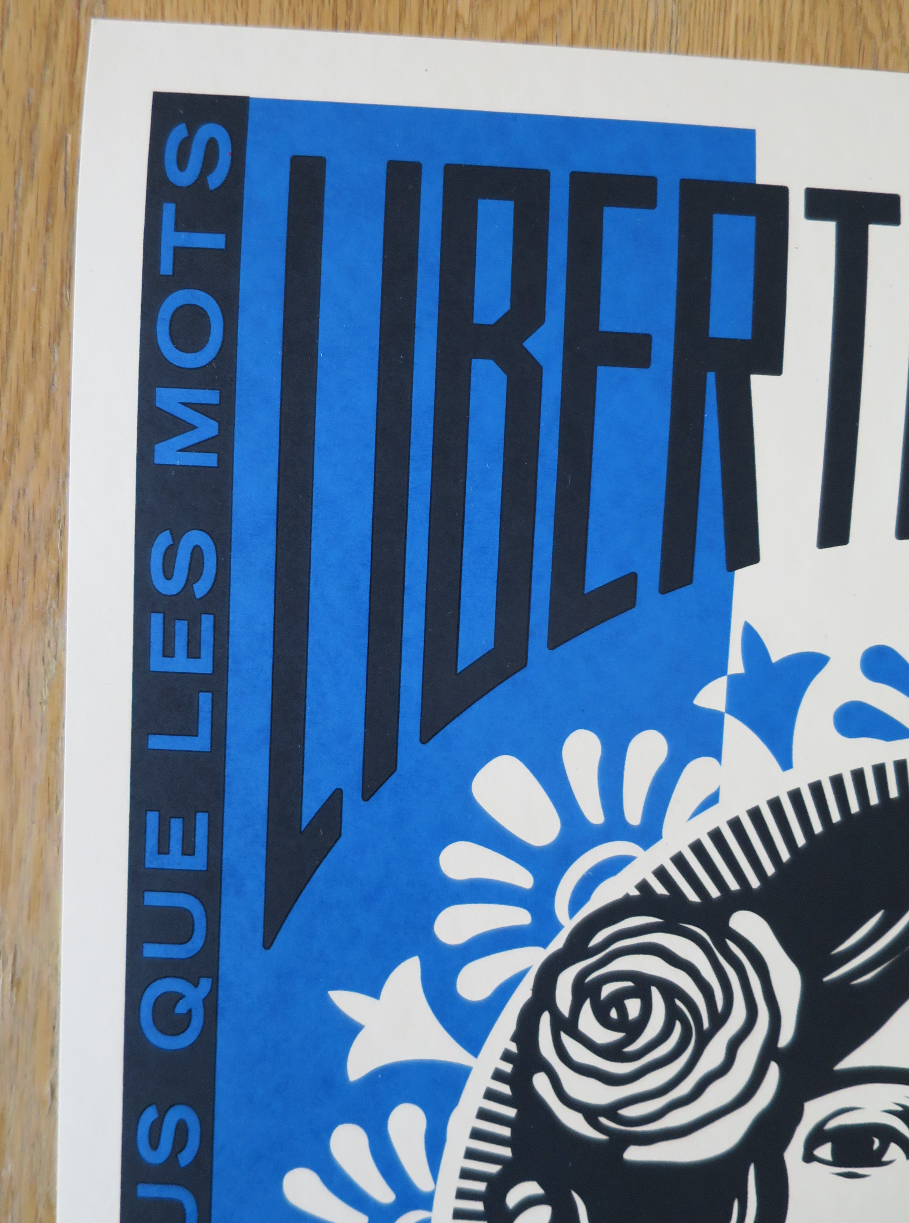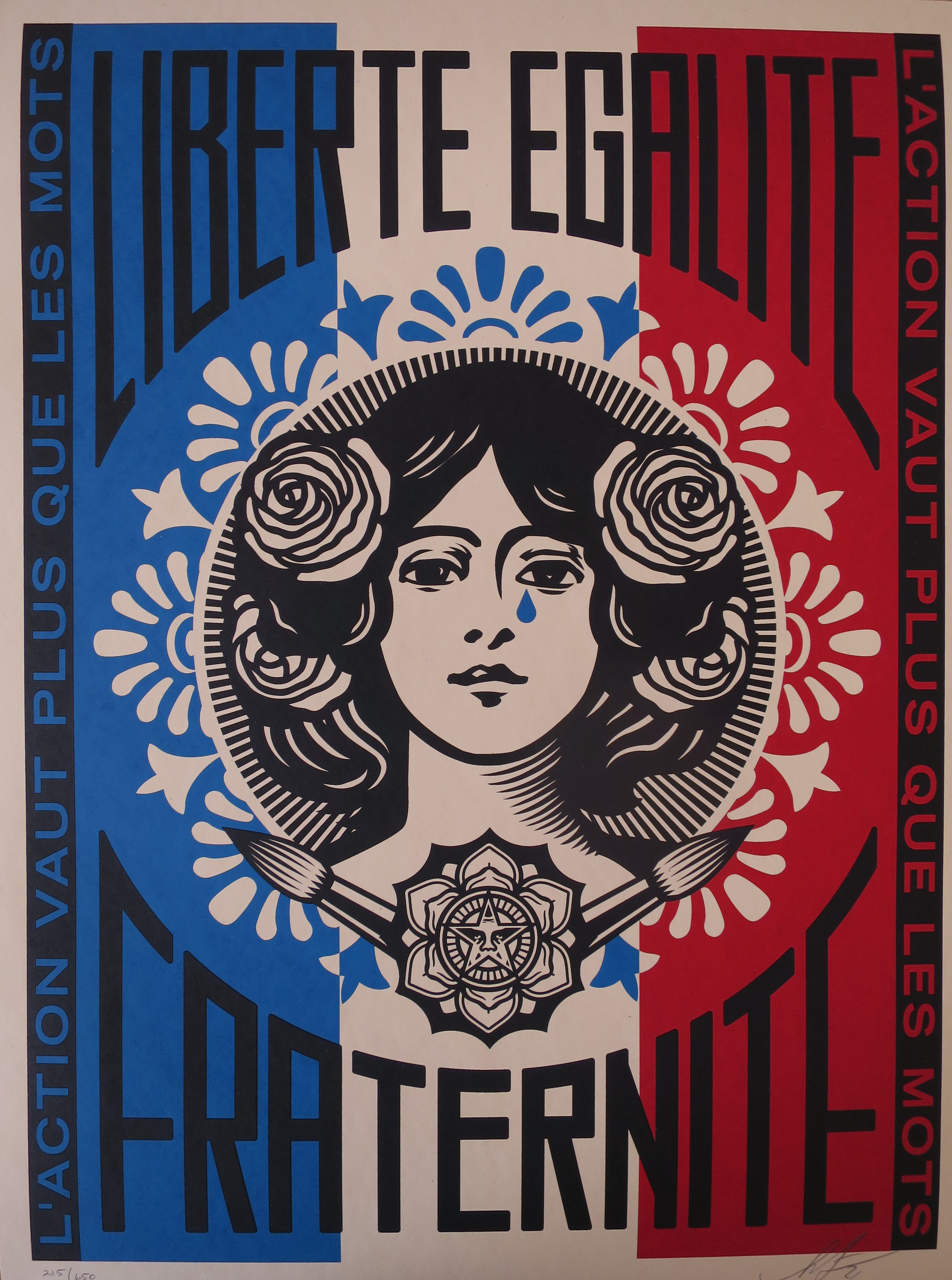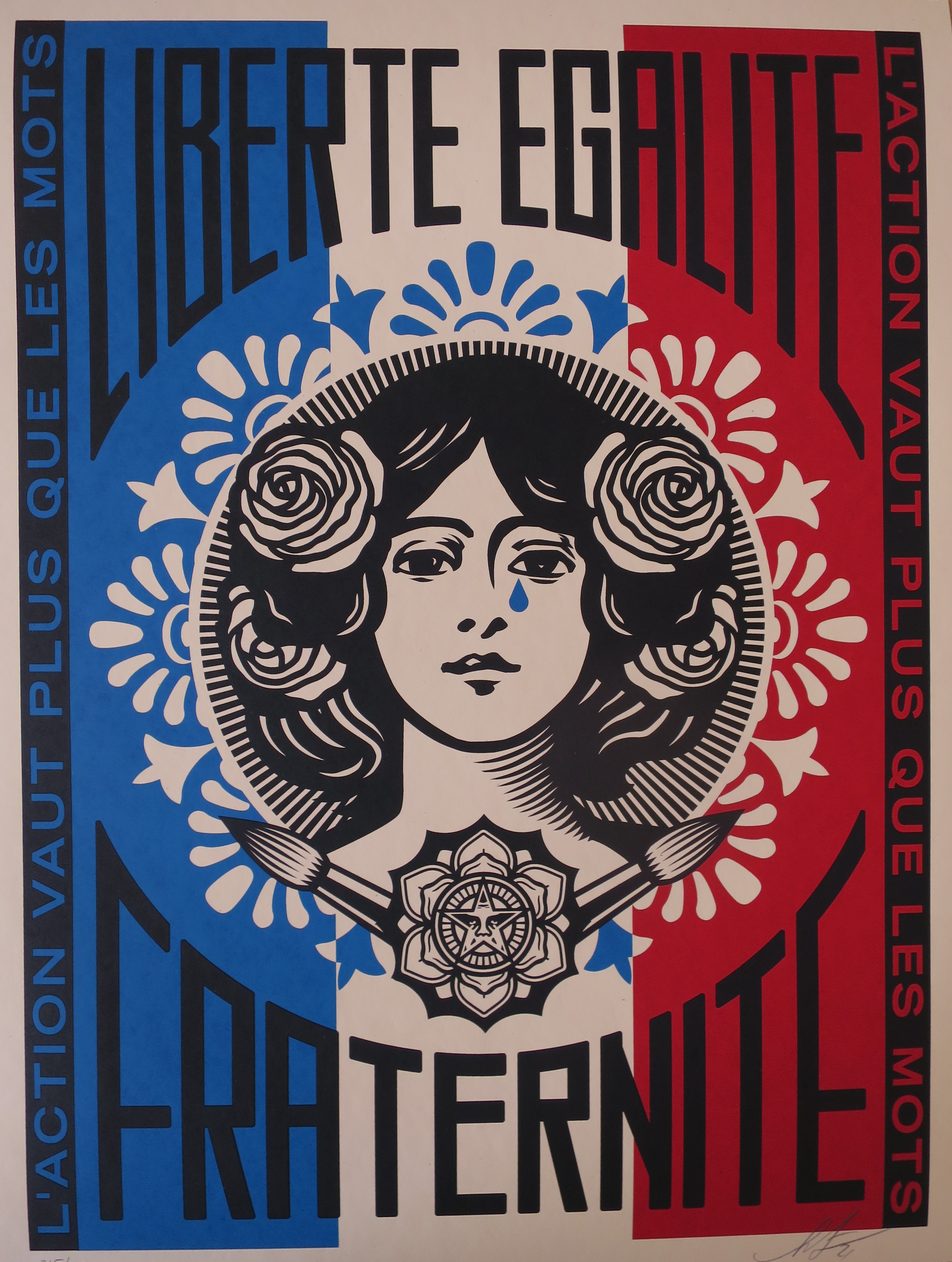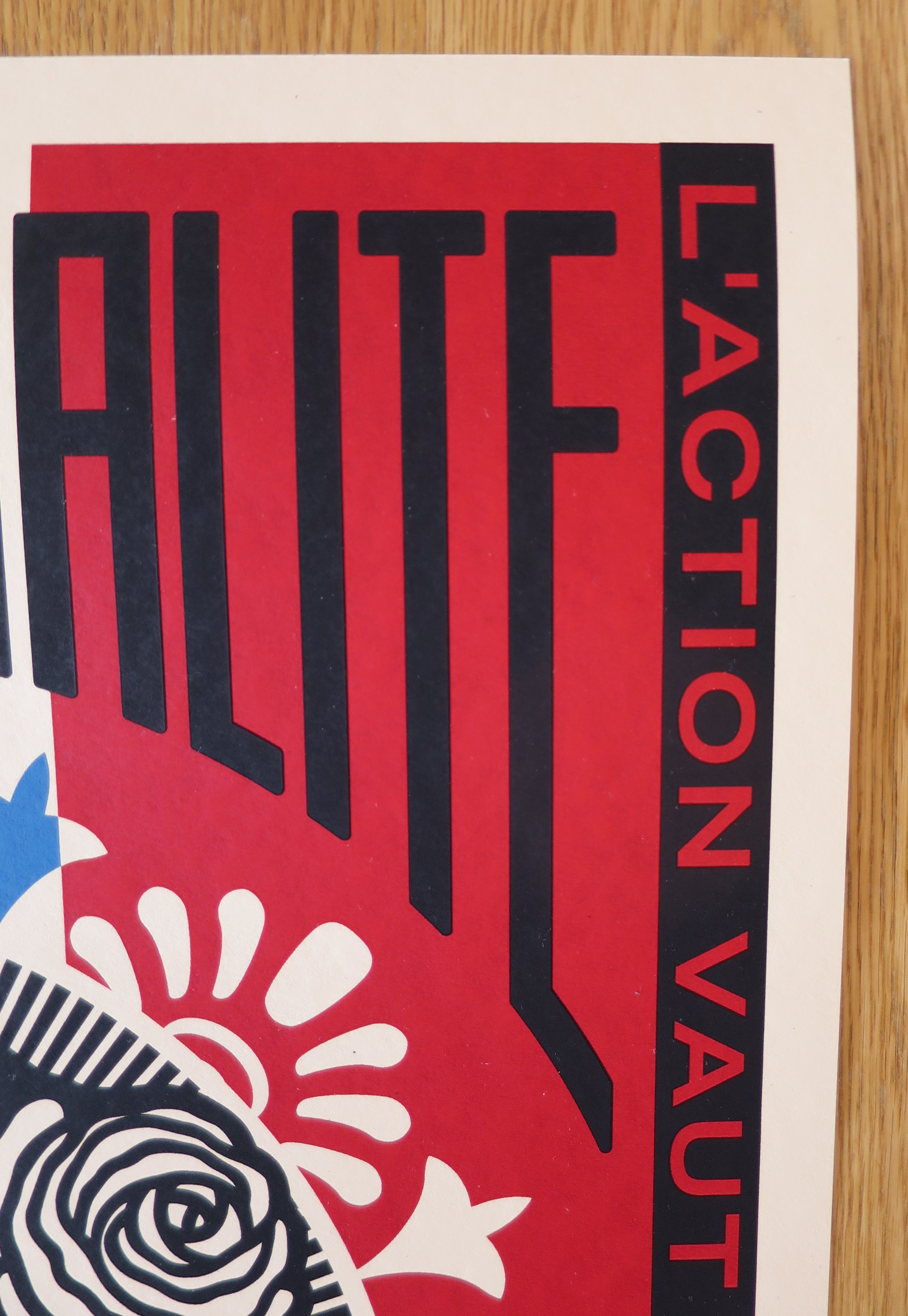 Shepard FaireyObey Marianne Action spricht lauter als Worte, zweite Ausgabe von Liberty Equality Fraternity Siebdruck auf cremefarbenem Speckletone-Papier. Signiert von Shepard Fairey. Limitierte und nummerierte Auflage von 650 Exemplaren. Jahr 2021 Die gesendete Nummer kann unterschiedlich sein Abmessungen: 61 x 46 cm
