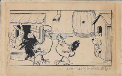 Dessin original signé à l'encre de chine et à l'aquarelle bleue sur carton, 8,5x15 cm, titré en bas au crayon à papier « devant le coq la poule se tait ». Scène humoristique se déroulant dans une