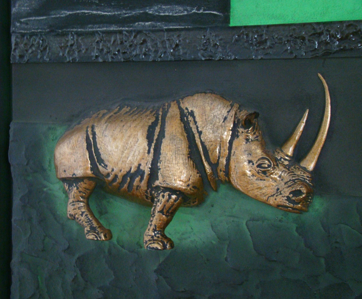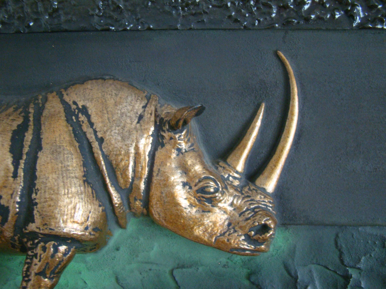 Rhinoceros model and the star are gilded with 12 carat white gold leaves oxidized.