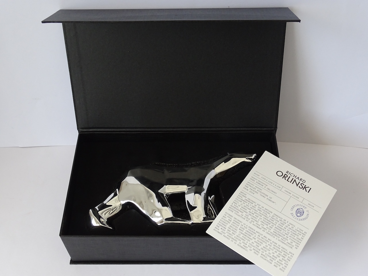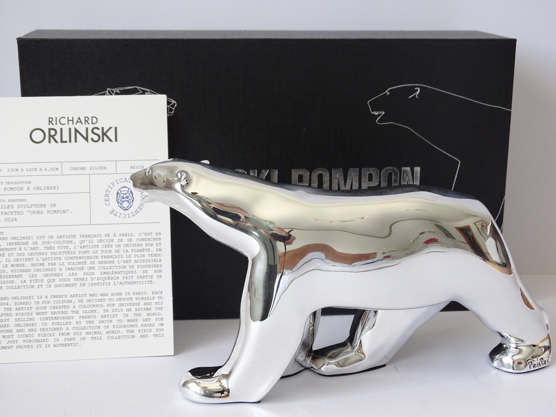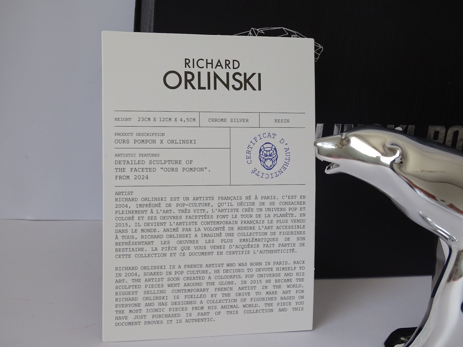 Richard Orlinski : (1966-) was born in Paris in 1966. He is a sculptor since 2004. His works are conceived after the concept "Born Wild", with contemporary materials, in a contemporary style, and are aimed at a large public, children included. Indeed, he is an advocate of the idea that art must be accessible to everyone. In that aim, he draws his inspiration from popular imagery, or icones, that serve his intentions. His works are exhibited worldwide (90 galleries), from the Fiac, to Courchevel ski station. Since 2011, he is in the Top 10 list of french artists who are the most sold in the world (according to Artprice). One of his works has been sold at auctions for 680 000 €.