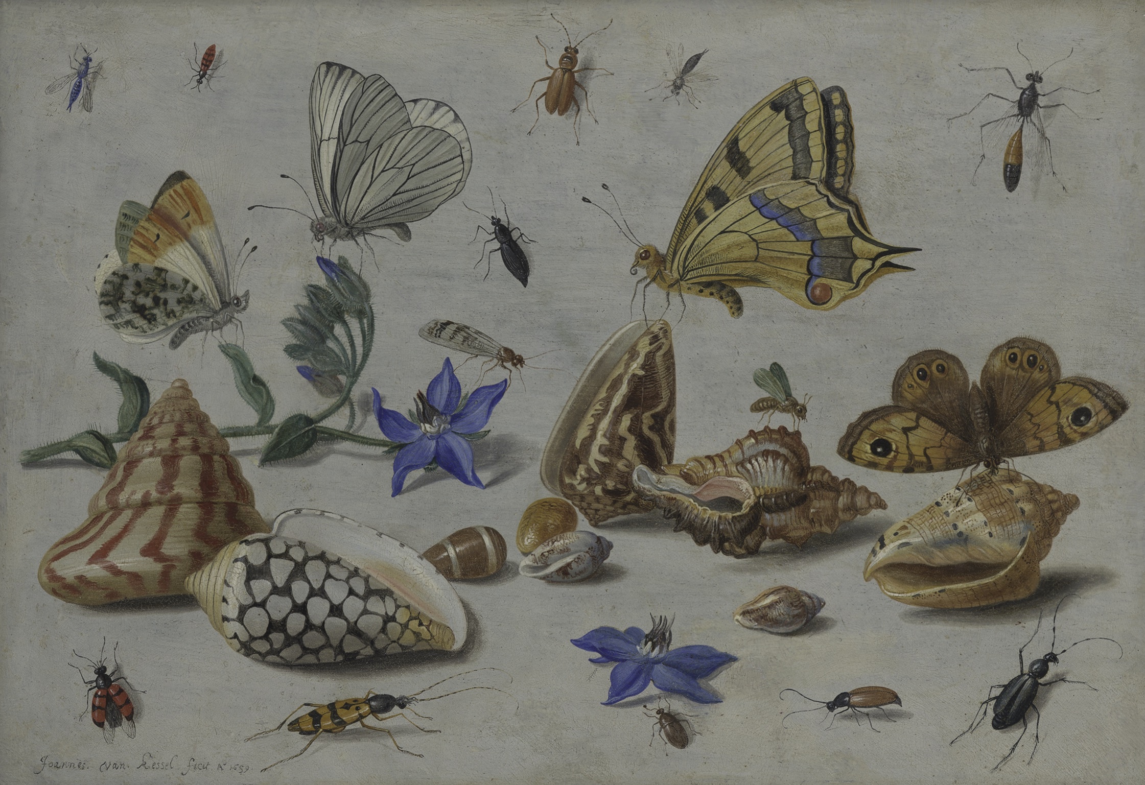 Este estudio, una recopilación minuciosamente observada de objetos naturales, es típico del trabajo de Jan van Kessel. Hay un elemento innovador de trompe l'oeil en el trabajo, en el que cada elemento tiene una sombra, por lo que parece estar acostado sobre una superficie plana o, en el caso de algunos de los insectos, trepando por una pared plana. Algunos de los escarabajos y moscas de la composición están dispuestos por separado, como especímenes en el gabinete de un naturalista (y, de hecho, Kessel a veces pintaba frentes de cajones para coleccionistas adinerados). Otros elementos interactúan y se superponen como los elementos de la naturaleza muerta tradicional. Estos incluyen las conchas que se sientan frente a la flor azul cortada y las mariposas que se posan en la flor y las hojas. Todo se suma a una pequeña colección en sí misma, un Wunderkammer pintado ensamblado por una mente curiosa.