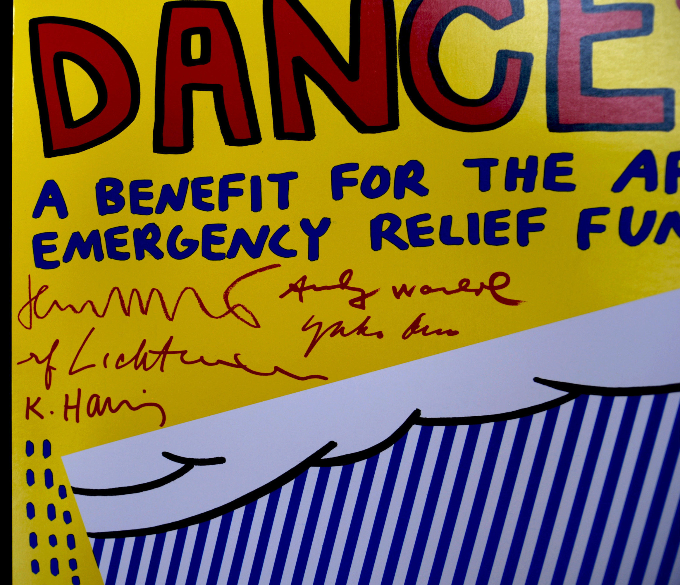 Firmas proyectadas de todos los artistas: Keith Haring, Andy Warhol, Roy Lichtenstein, Jean Michel-Basquiat y Yoko Ono. ¡Uno de los raros carteles diseñados por Basquiat!