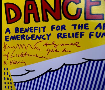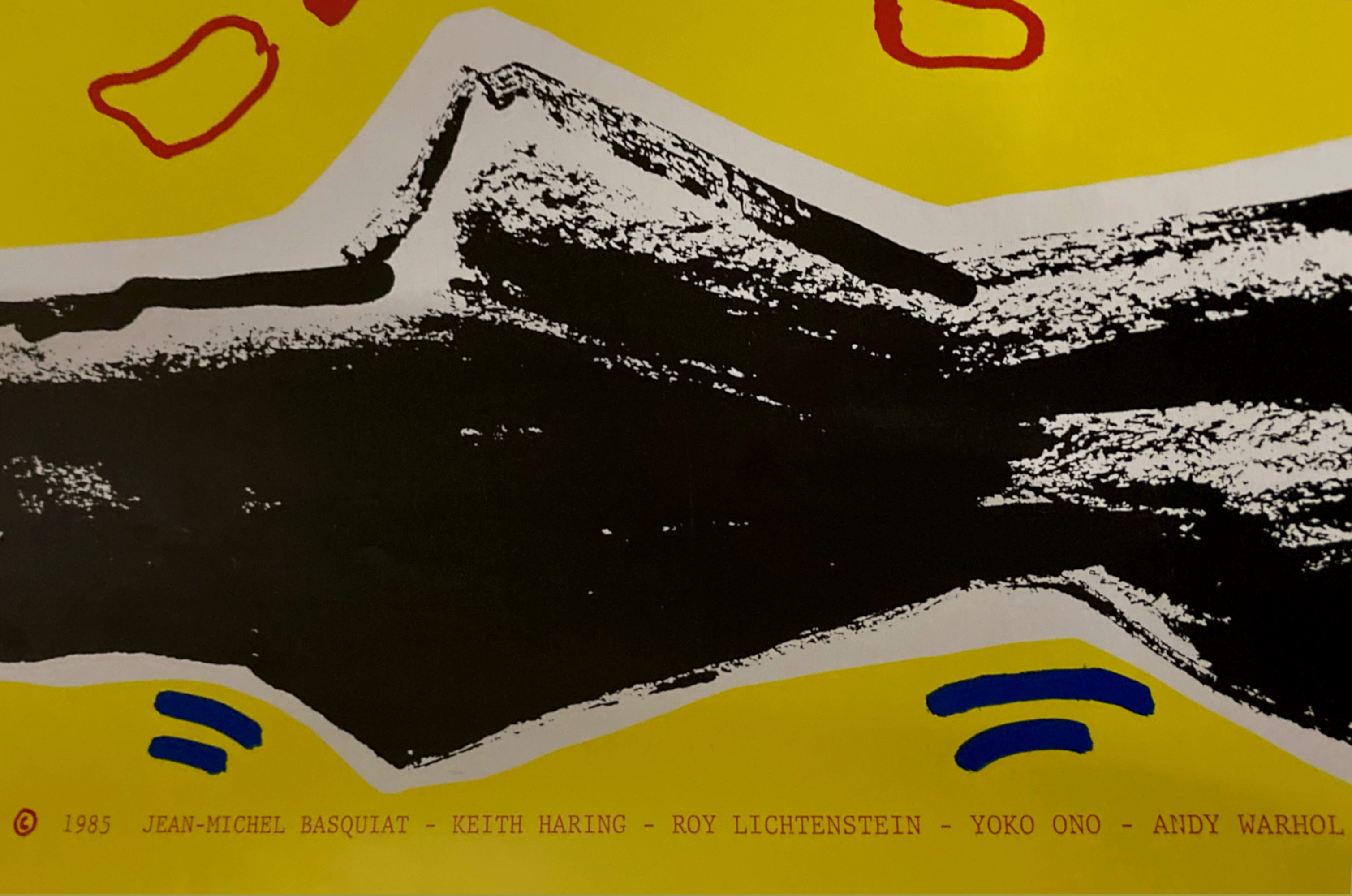 Screened signatures of all artists: Keith Haring, Andy Warhol, Roy Lichtenstein, Jean Michel-Basquiat, and Yoko Ono. One of the rare posters designed by Basquiat!