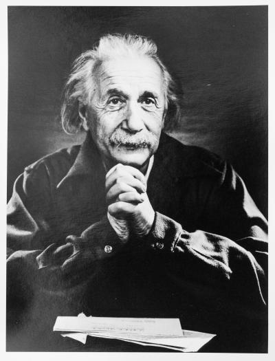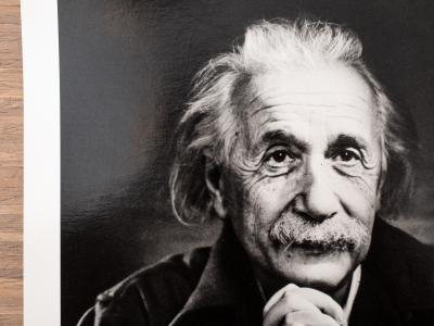 A famous portrait, in the typical dark style of Yousuf Karsh: Albert Einstein in his study at Princeton, taken in 1948. This is a real silver gelatin print, a numbered edition of 10 from 2009 (sold out for quite some years). The print is made by hand in a darkroom by a craftsman. The print is in fine condition, it has never been framed or hung.