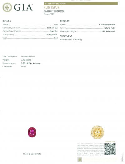 2,10 ct. Rubí sin tratar - BIRMANIA, MYANMAR: Certificado GIA Connecticut. Peso- 2,10 ct. Corte: corte escalonado modificado brillante ovalado Color rojo Claridad - VVS Dimensiones - 7,95 X 6,24 X 4,44 mm Origen - BIRMANIA, MYANMAR Tratamiento - Sin indicaciones de Calentamiento Informe GIA nº - 6242912324
