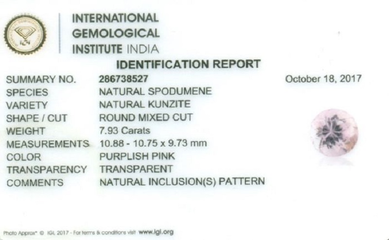 7.93 ct. Purplish Pink Kunzite - AFGHANISTAN : IGI Certified