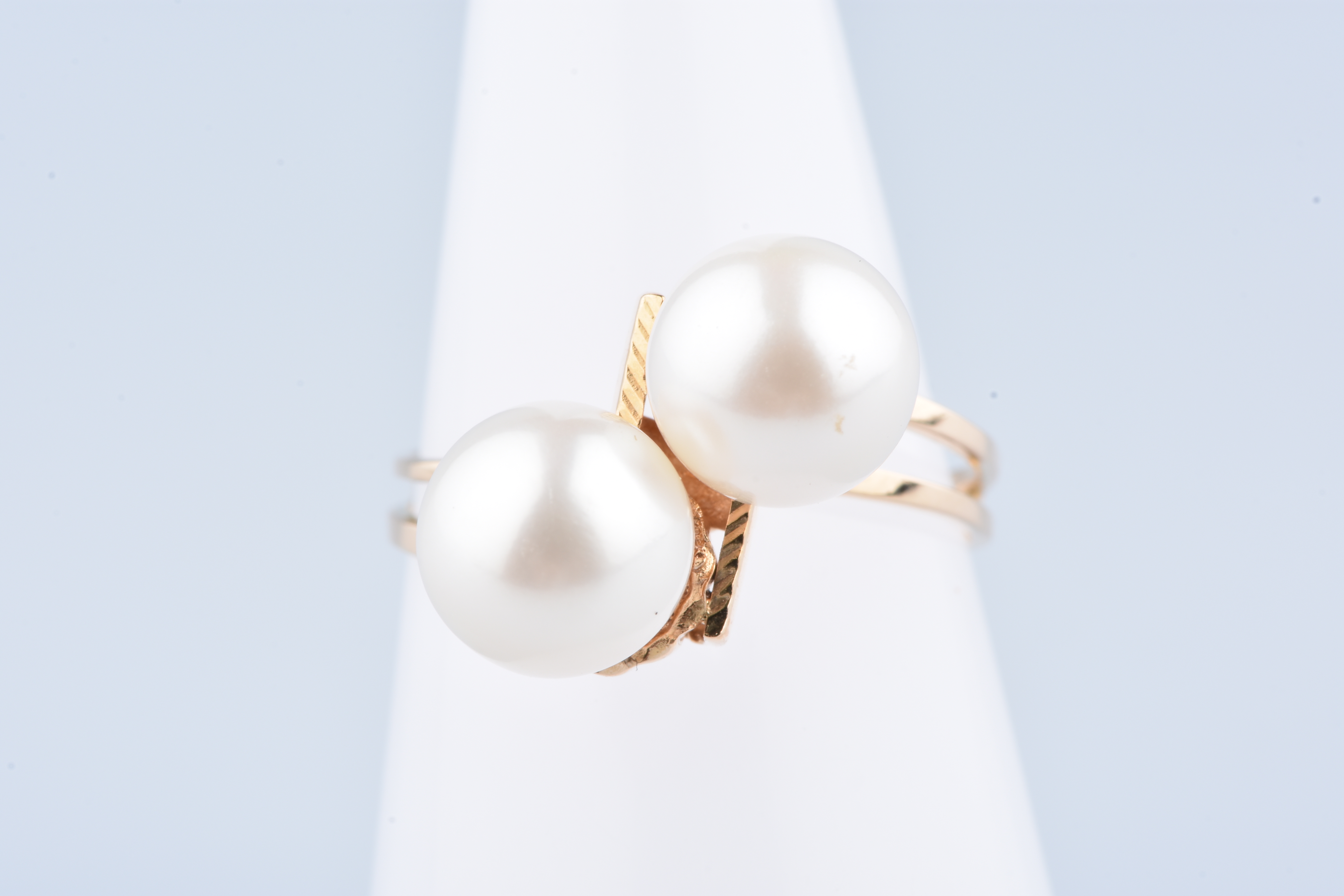 Bague en or jaune 18 carats sertie de 2 perles blanches.