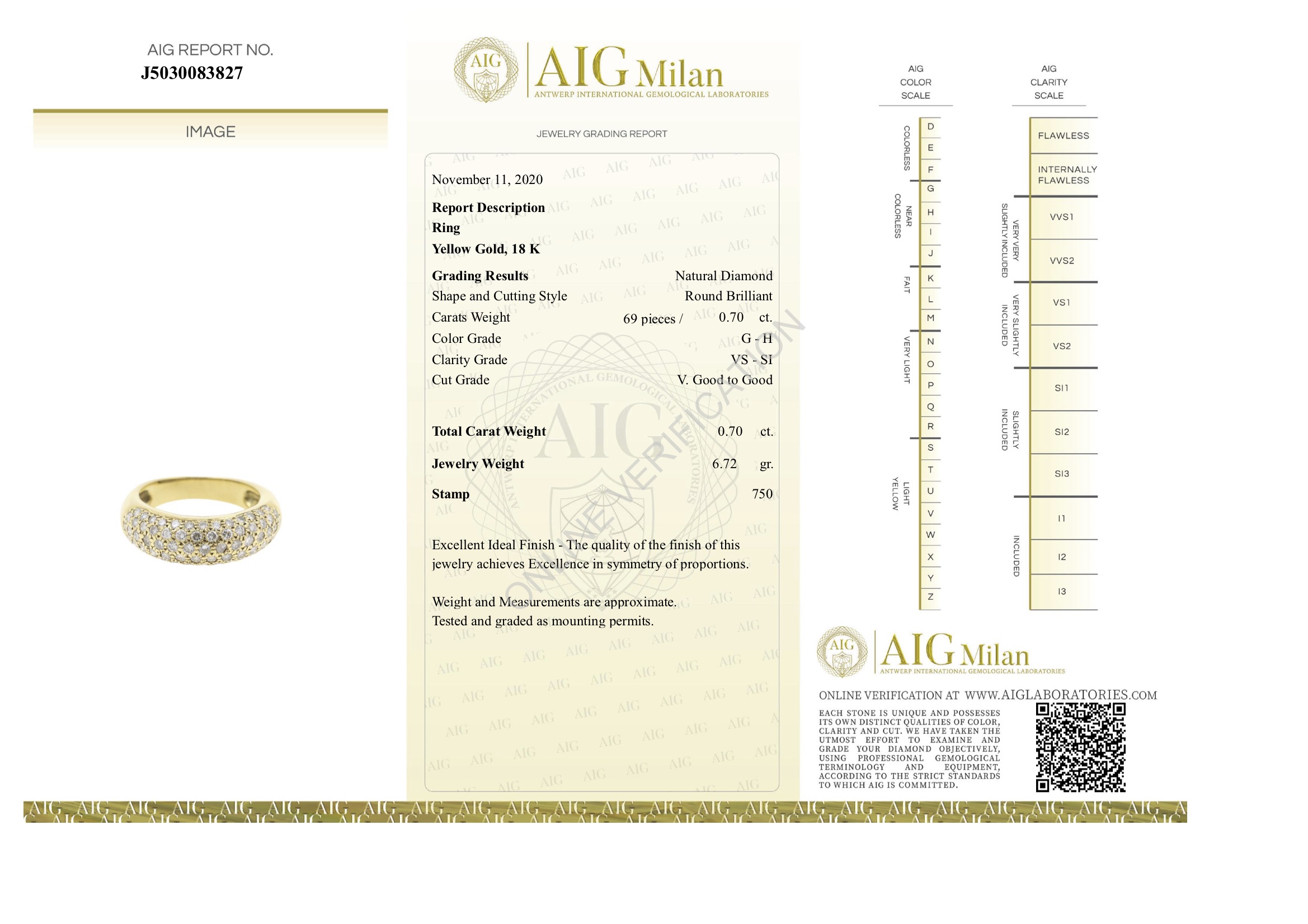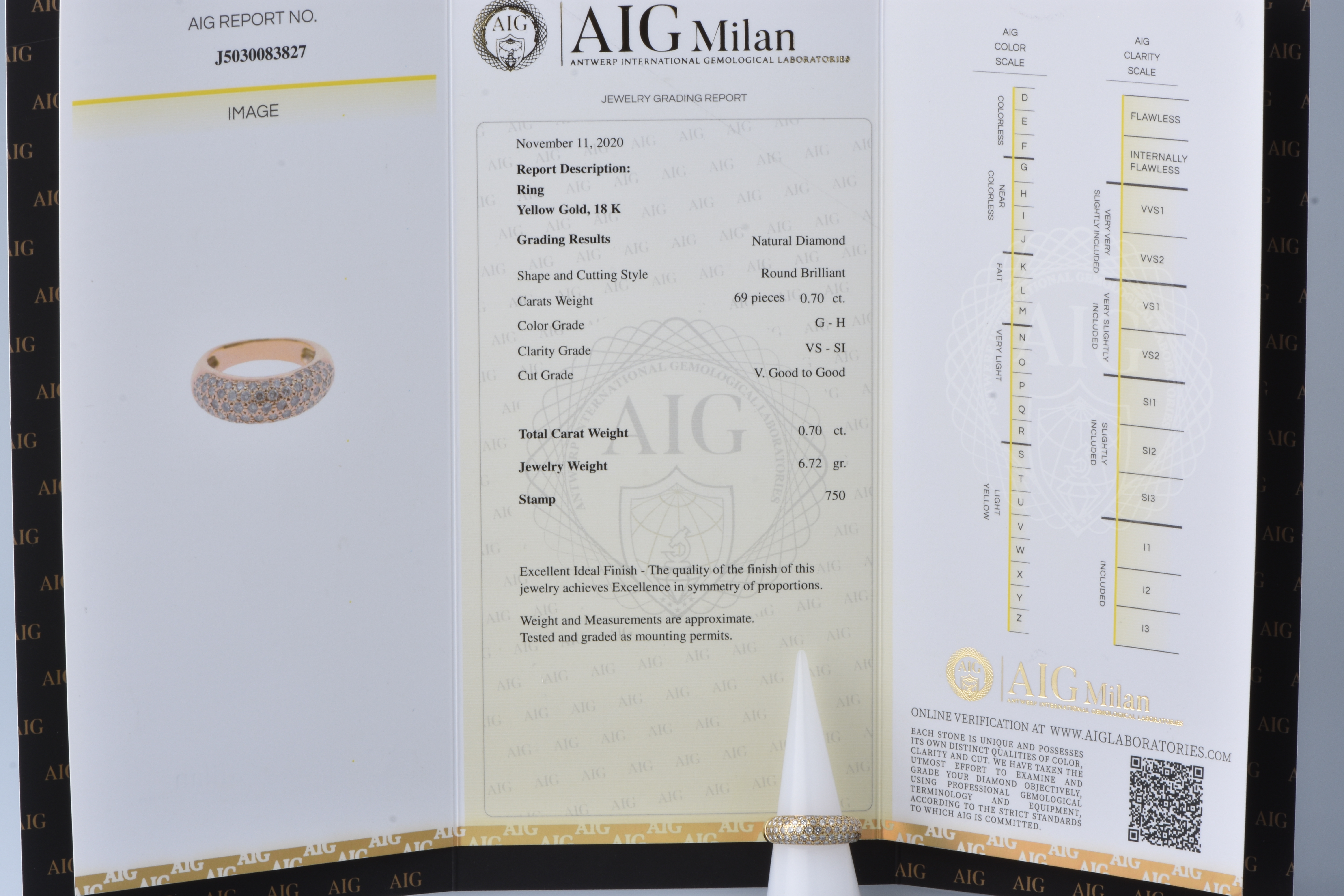 Anillo de oro amarillo de 18 quilates, pavimentado con 69 diamantes naturales redondos brillantes de 0,70 ct en total.
