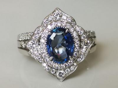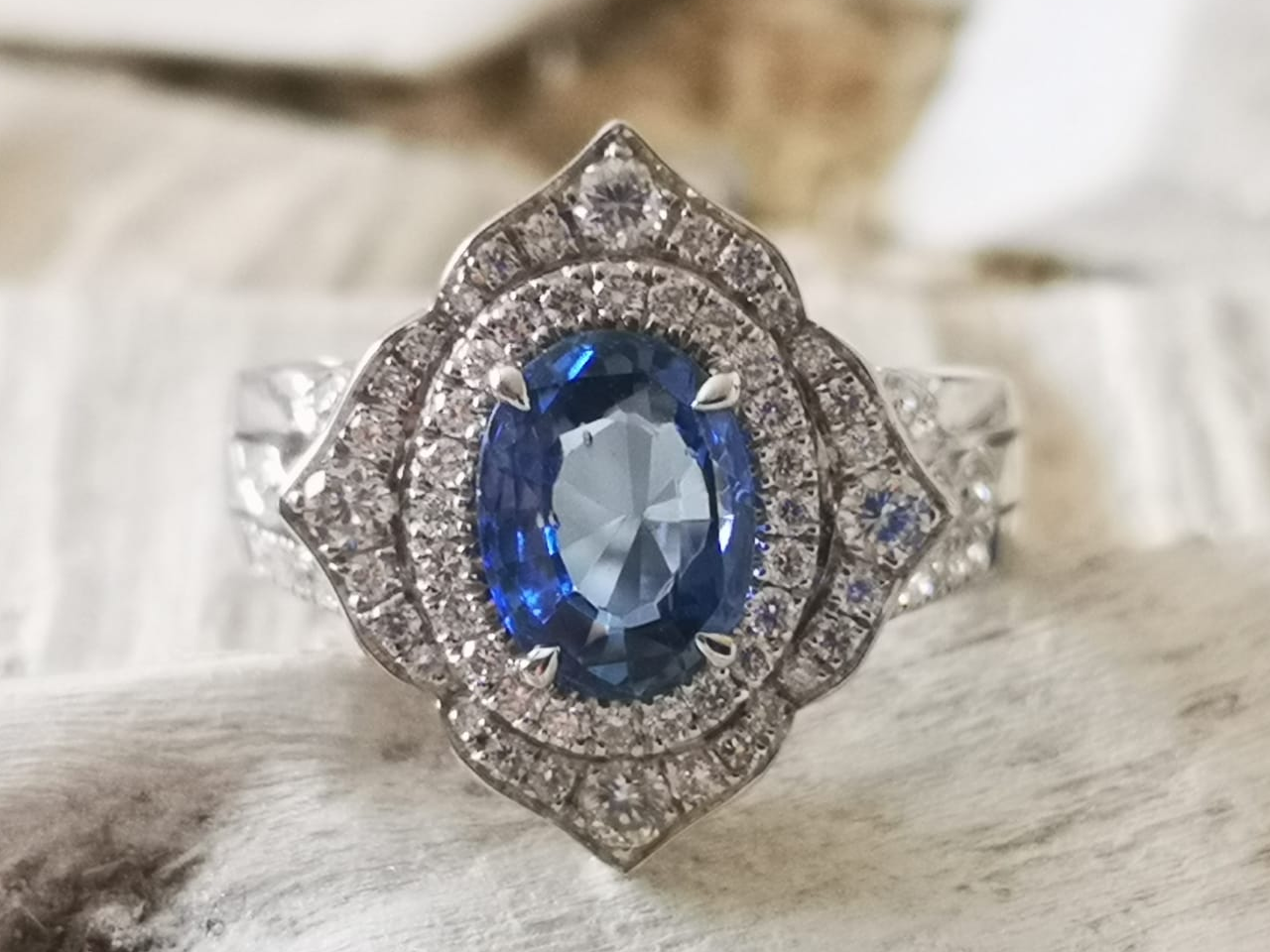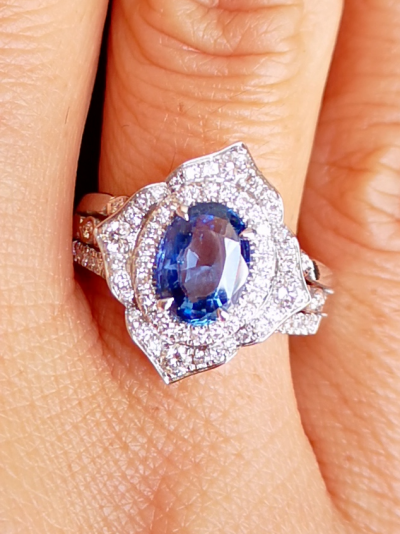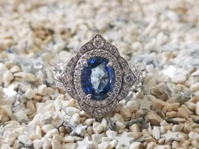Anillo de oro blanco de 18 quilates (750/1000) en forma de diamante adornado en su centro con un zafiro bonito y claro sin calentar de 1,94 quilates en un séquito de diamantes de alta calidad por