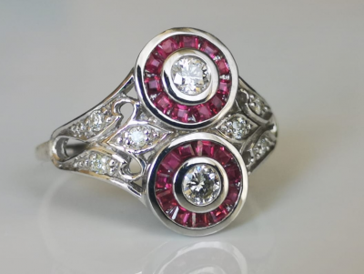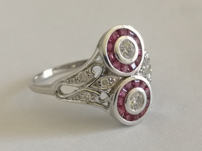BAGUE en or blanc 750 ( 18 KT ) ornée de deux motifs ronds sertis de RUBIS calibrés et de DIAMANTS ( 0,25 Carat ) -