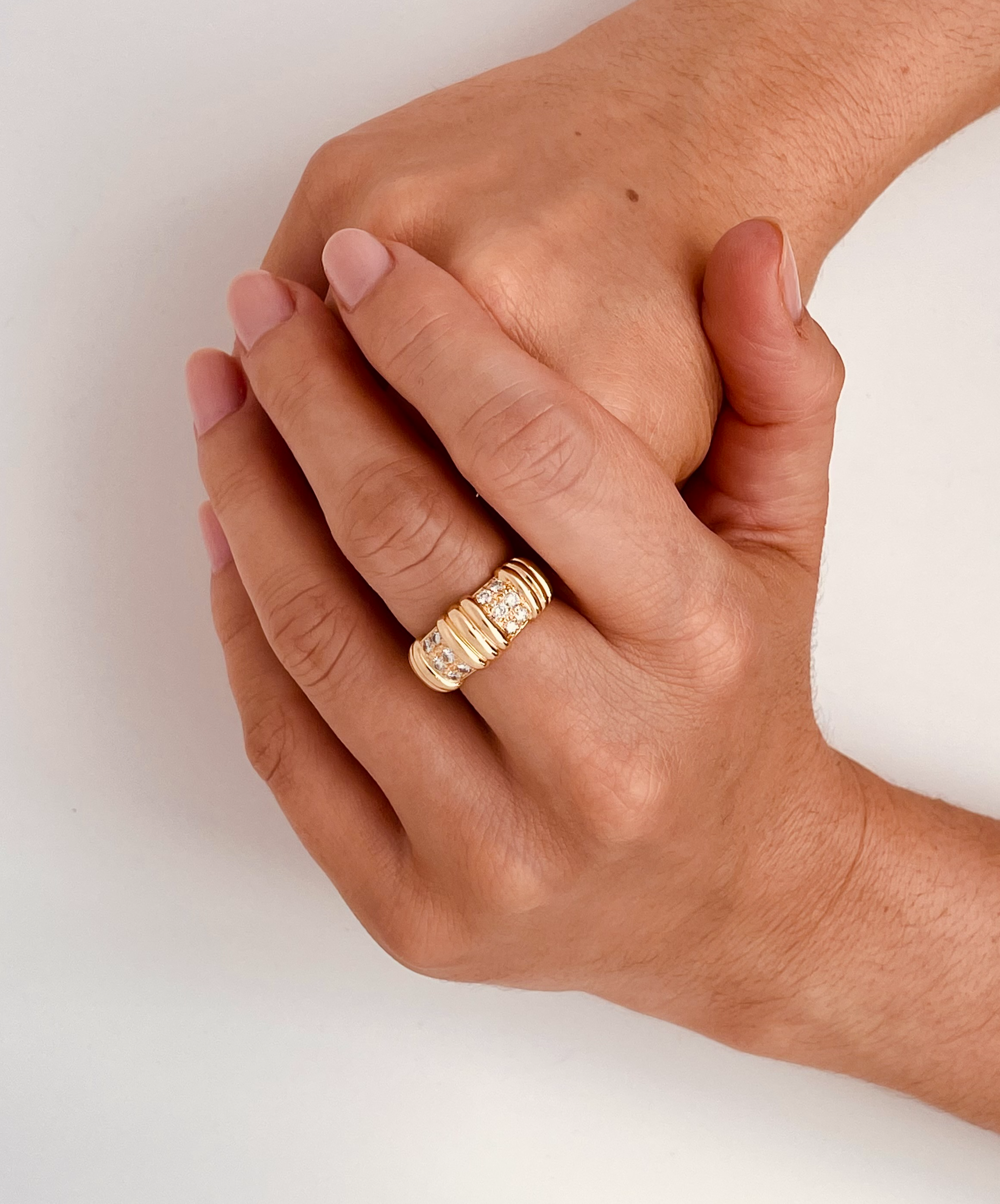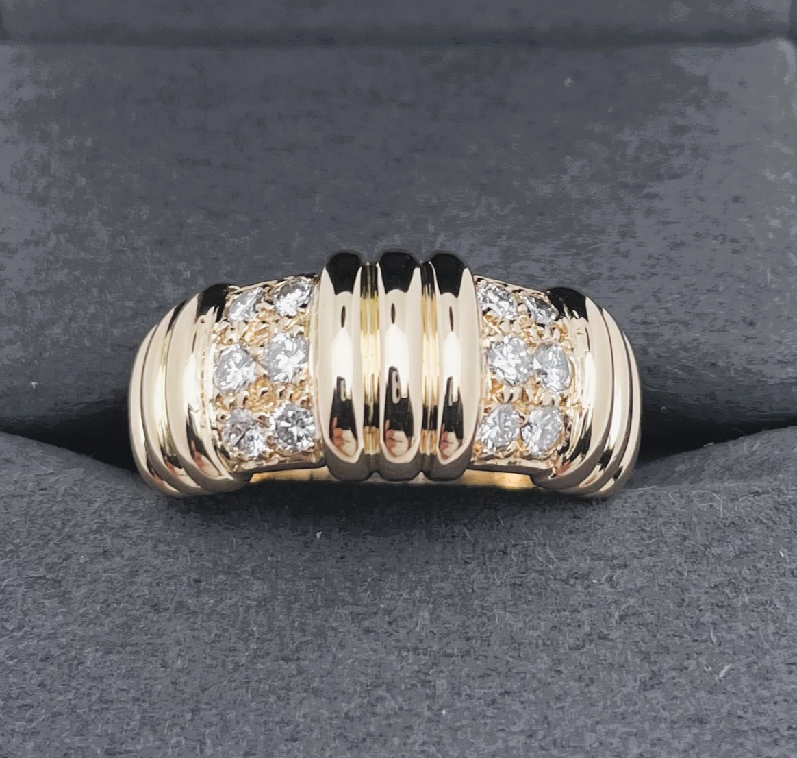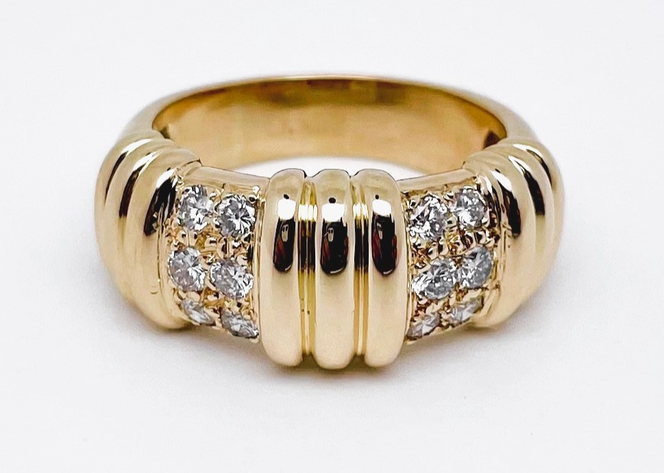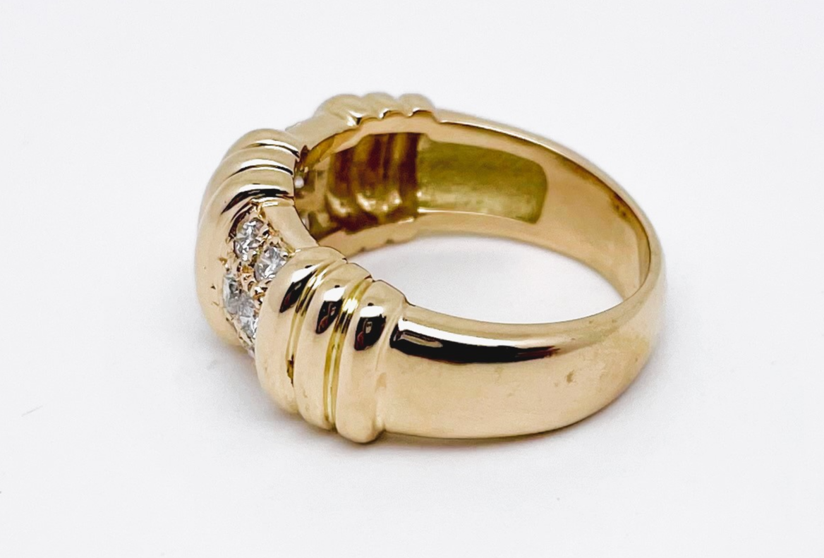 Bague en or jaune poli brillant 750/1000 (18K) ornée d'un motif à godrons et diamants de taille brillant.