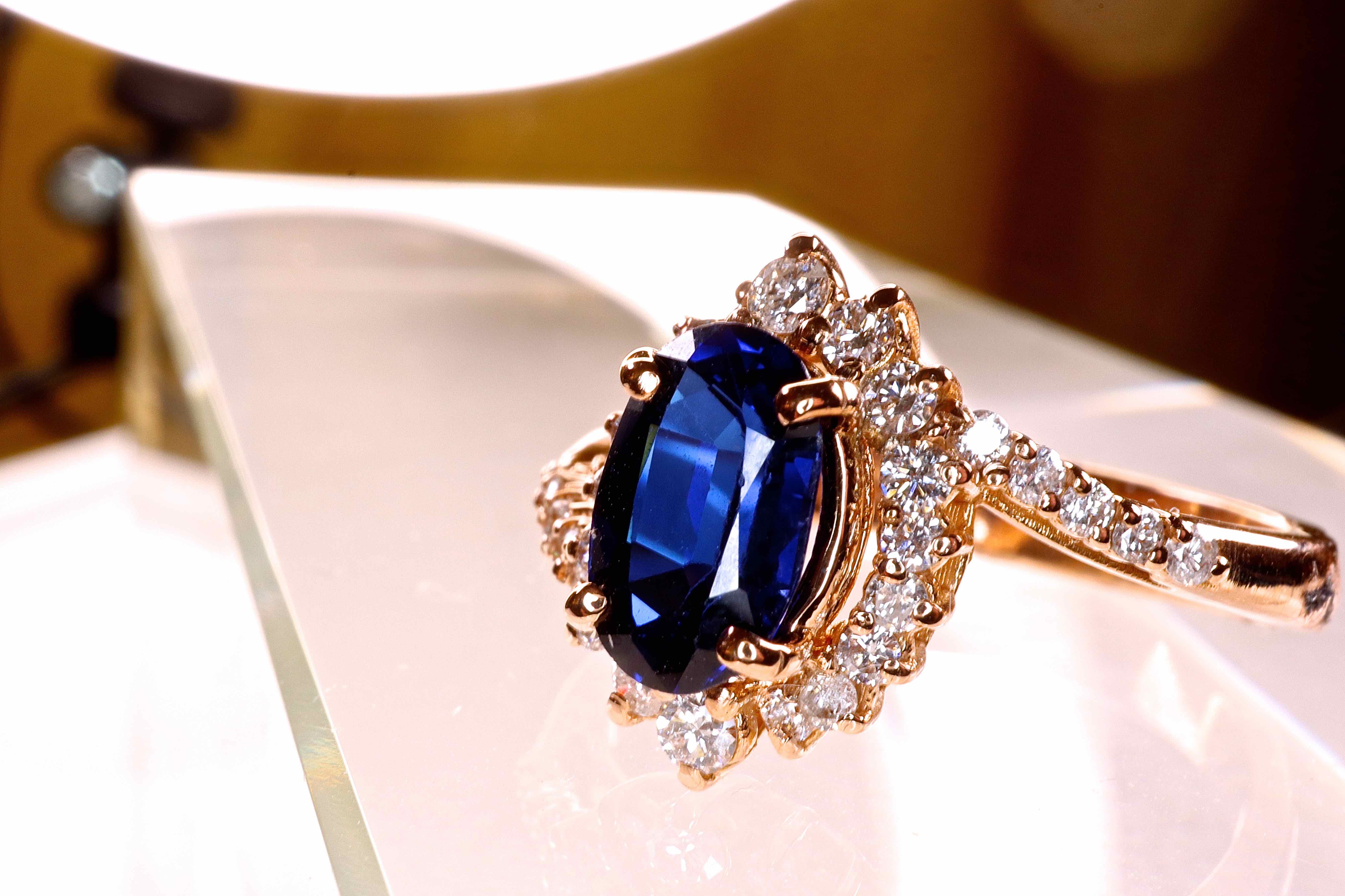 Haute Joaillerie. Bague unique faite main par designer en or rose 18 kt. Exceptionnel Saphir ovale transparent pour 1.46 carats certifié et 28 diamants naturels de haute qualité de 0.70 carats - F-G/VVS.. Taille 56 modifiable toutes tailles sur demande. 4,6 grammes. Luxueux écrin.