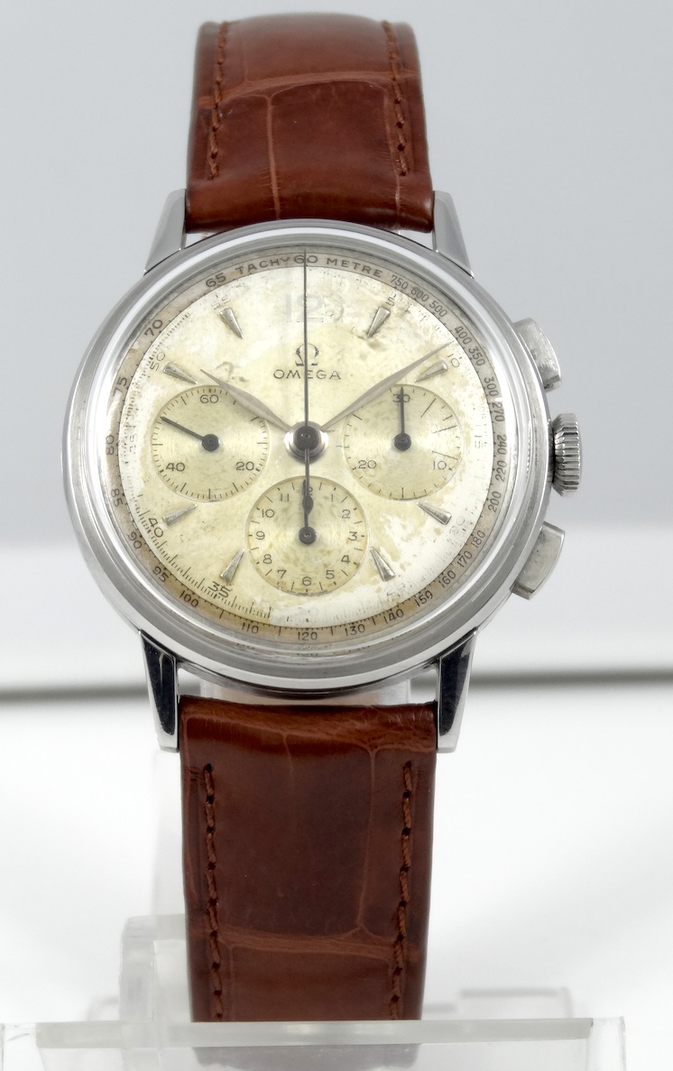 OMEGA Chrono Acier, mouvement mécanique à remontage manuel, calibre 27CHRO C12, mouvement précédant le fameux 321 Lemania, équipant les Speedmaster Moon.