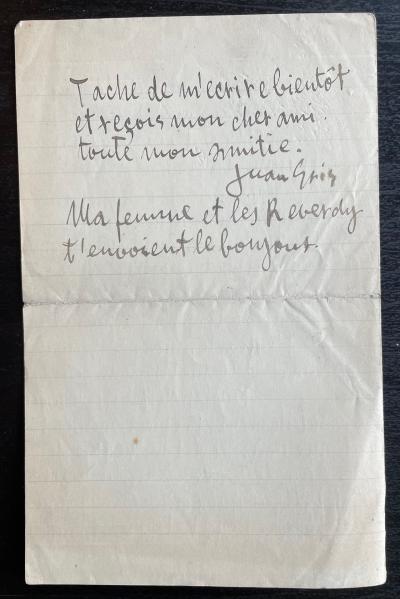 cher ami toute mon amitie. Juan Gris Ma femme [Josette] et les Reverdy t'envoient le bonjour »