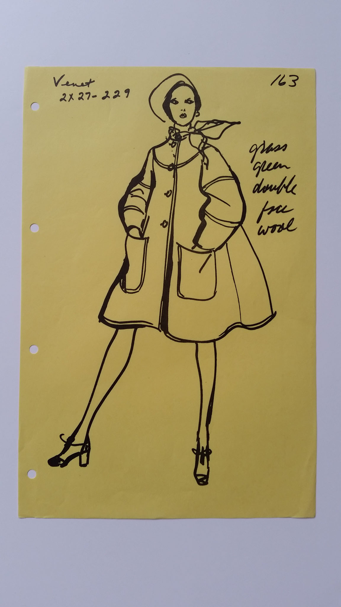 Bonito boceto para el conjunto de chaqueta y falda de Philippe Venet realizado por la oficina de estilo neoyorquino del diseñador firmado Philippe Venet.