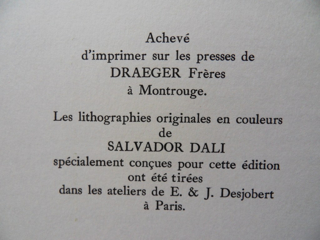 Petit in- 4° (22 X 28 cm) broché, couverture illustrée par Dali rempliée, 28 pages non chiffrées, portrait de Dali en frontispice, illustrations in texte, 4 lithographies originales en