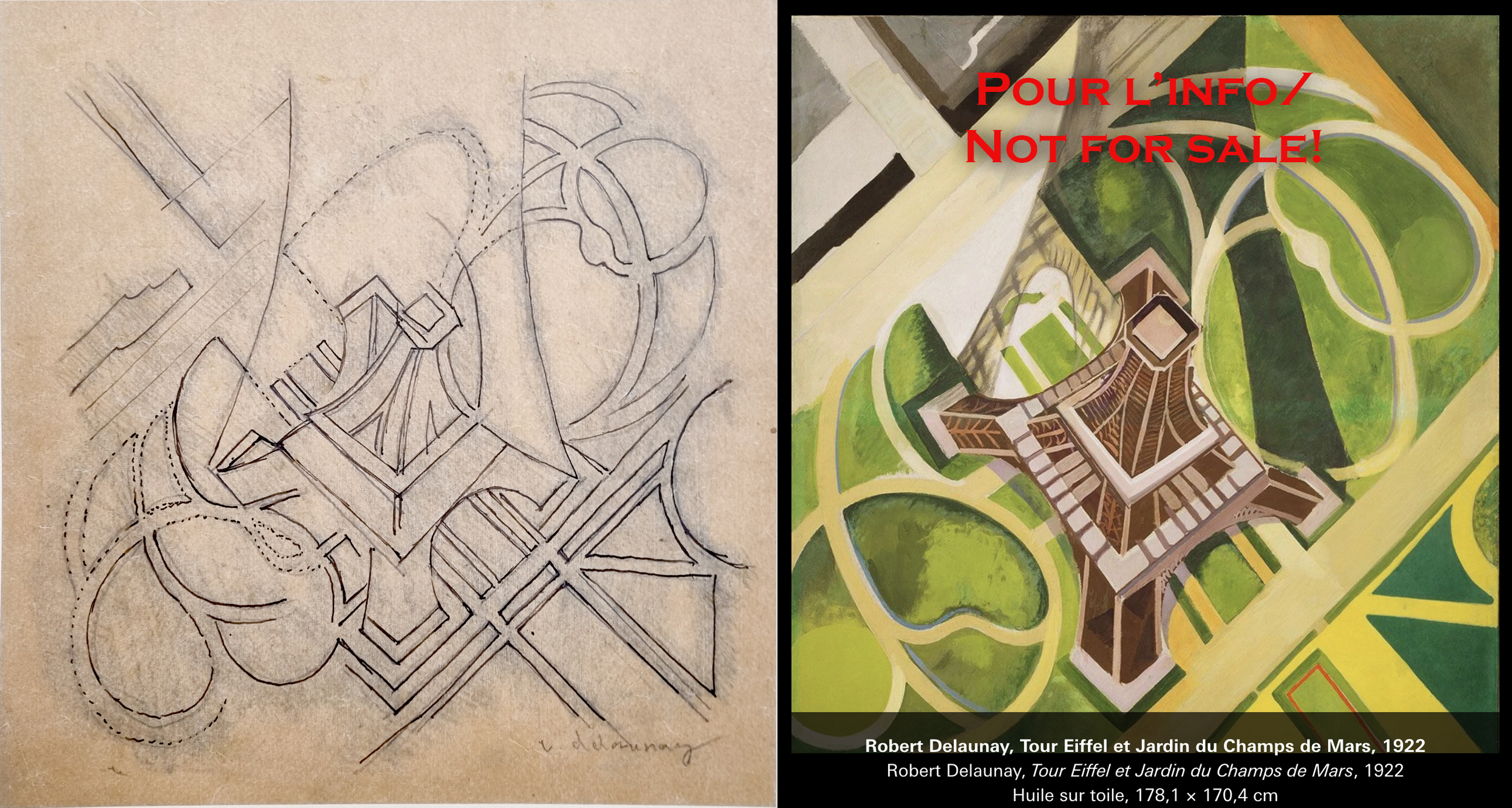 Historique : Il s'agit du seul dessin préparatoire identifié pour le tableau La Tour Eiffel (et le jardin du Champ-de-Mars), avec celui conservé au Centre Pompidou (réalisé deux ans plus tard pour