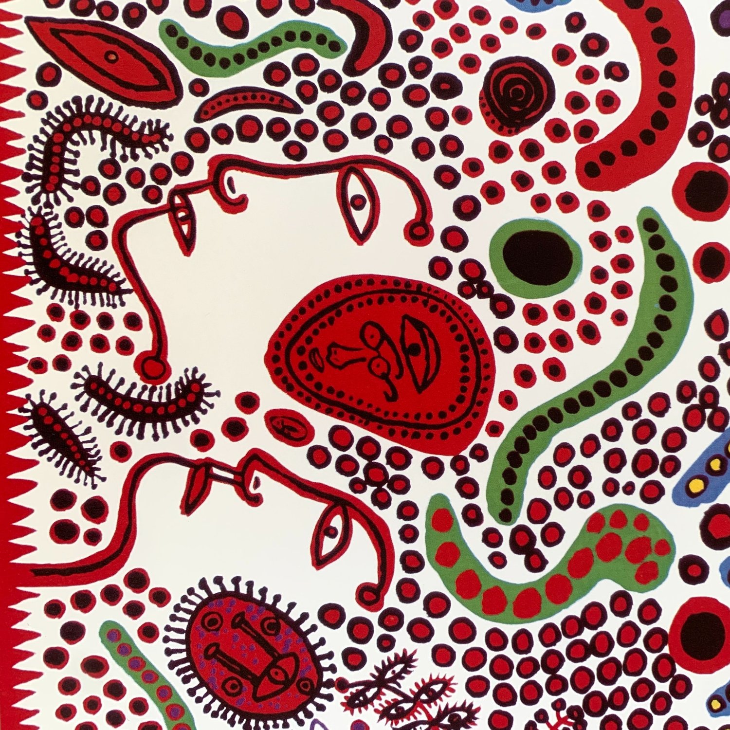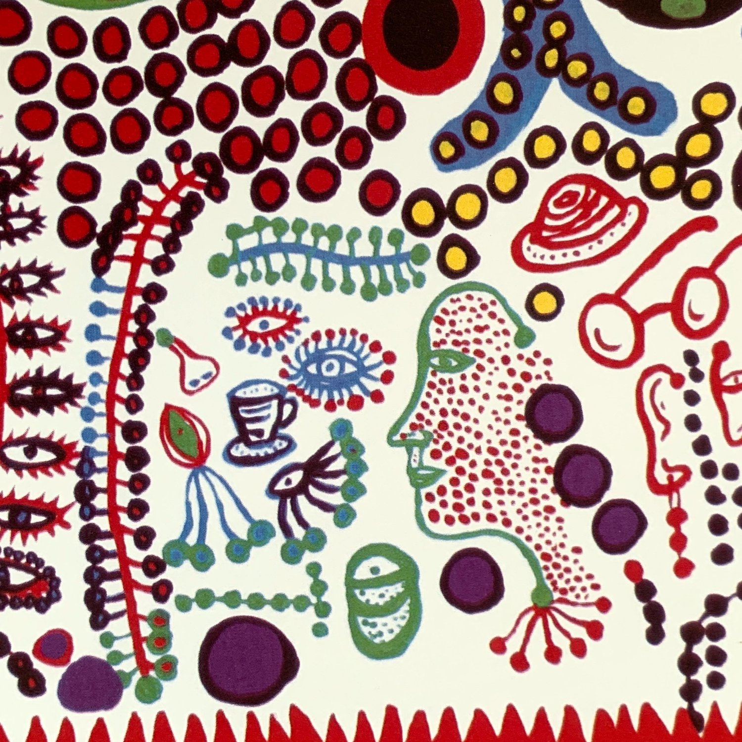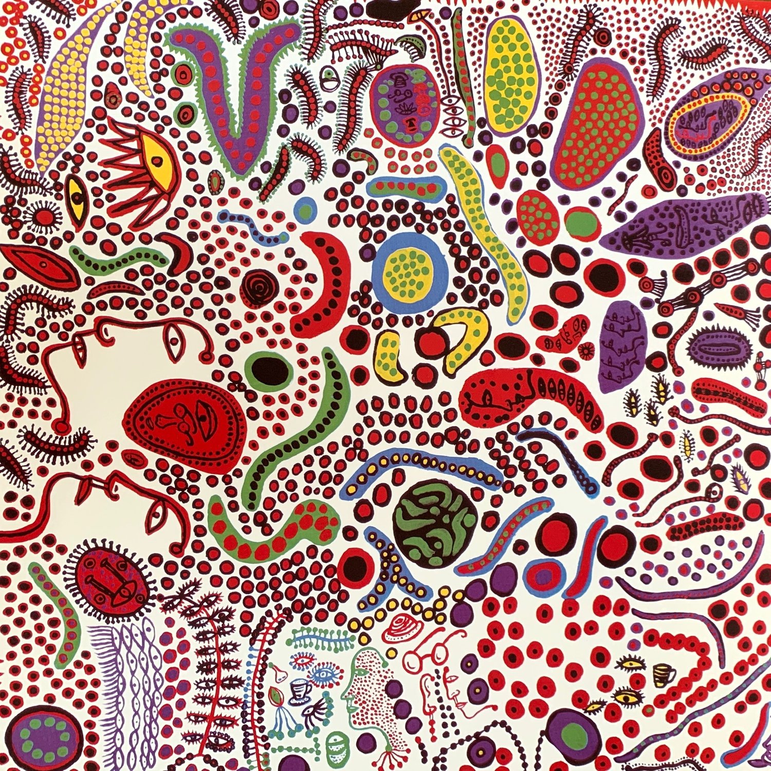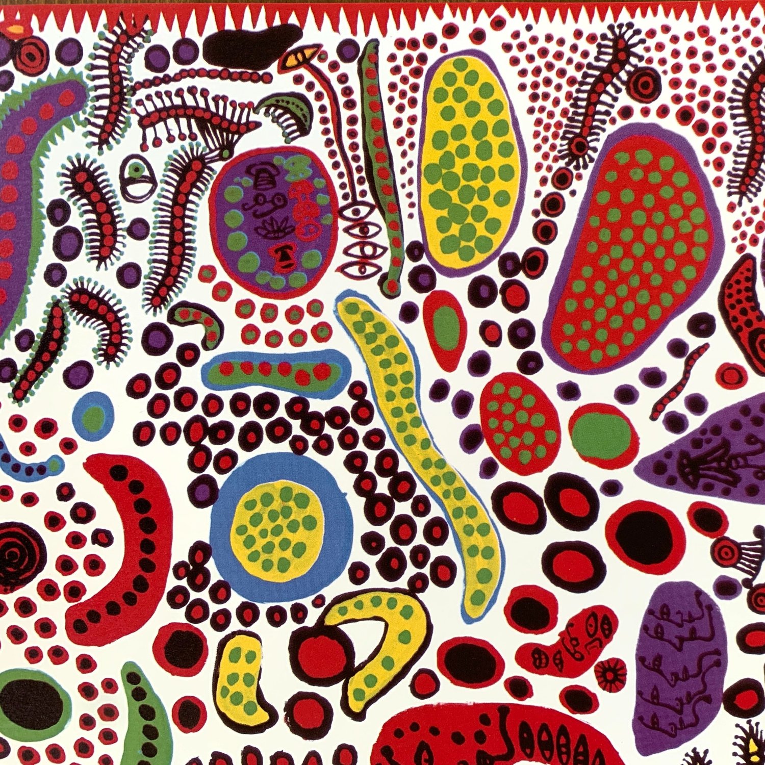 (née en 1929) est une peintre, sculptrice et écrivaine contemporaine japonaise. Elle est mobilisée à l’âge de 13 ans dans la guerre du pacifique après l’attaque de Pearl Harbor en décembre 1941, pour coudre des parachutes et des uniformes militaires. Très jeune, Yayoi Kusama est soumise à des visions qui la mènent à la création artistique, une pratique appelée le « self oblitération ». Yayoi Kusama poursuit des études en art, à Kyoto puis aux Etats-Unis, ce qui demeure très rare à cette époque. Yayoi Kusama se révolte contre sa société patriarcale, les violences de sa mère, et les inégalités qui l’entourent, à travers peintures, sculptures, collages, photos et installations, qu’elle exposent aux côtés de Yves Klein, Piero Manzoni, Claes Oldenburg, et Andy Warhol. Yayoi Kusama organise également des performances aux Etats-Unis, souvent nue, en vue de provoquer et choquer. En 1968, elle fonde son atelier de mode, le « Kusama Fashion Company Ltd », aux tenues excentriques qui rappellent ses œuvres. Yayoi Kusama retourne au japon en 1973, et vit désormais en hôpital psychiatrique, où elle possède son propre atelier.