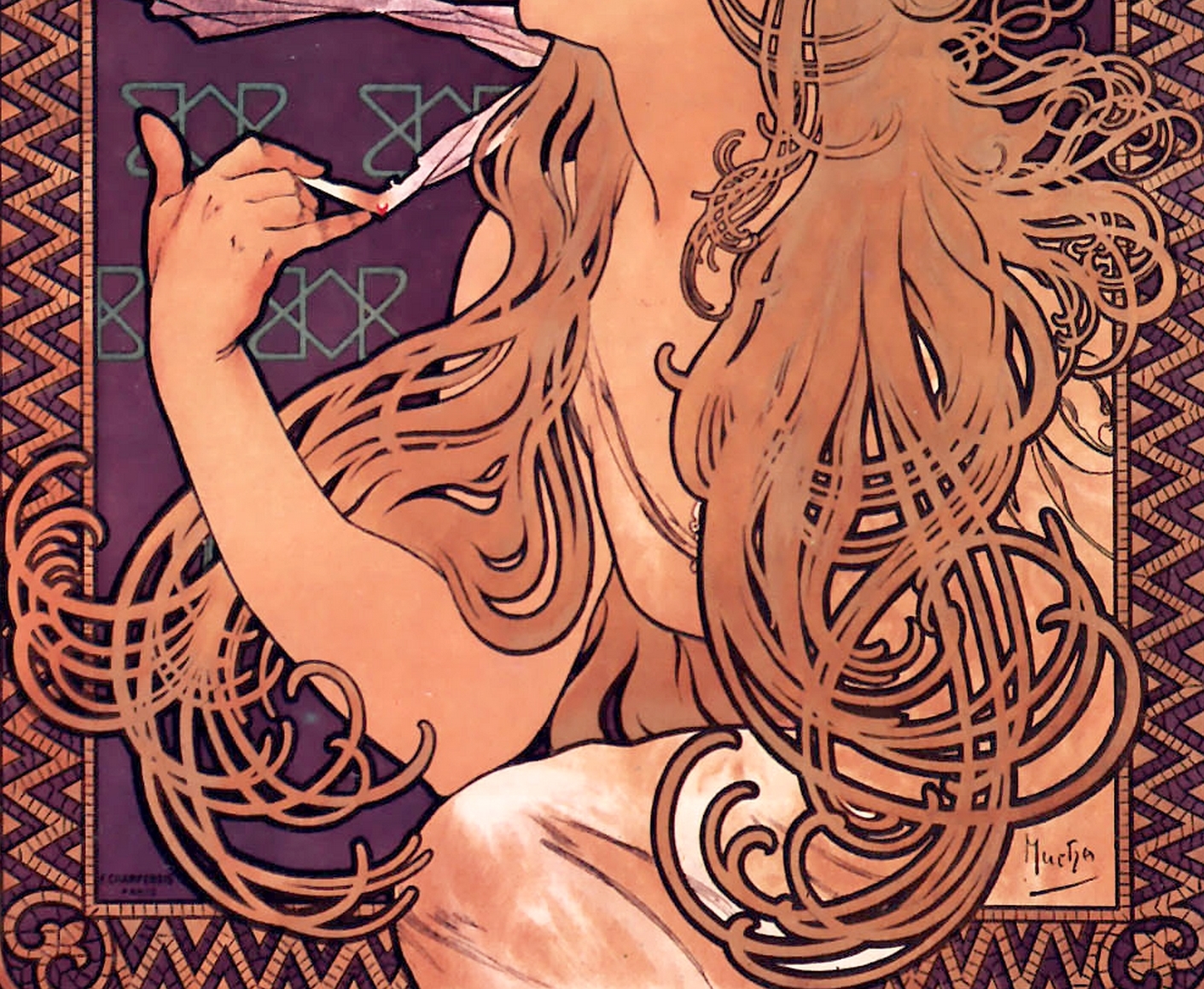 Alfons Mucha : (1860-1939) est un affichiste, illustrateur, peintre et architecte d’intérieur tchèque. Il est aujourd’hui considéré comme l’un des pionniers de l’Art Nouveau. Enfant, il est d’abord orienté par le chant, mais peint déjà quelques toiles, de nos jours très recherchées. Il est refusé des Beaux-Arts de Prague en 1878, ce qui ne sera pas suffisant pour le décourager. Mucha séjourne et travaille à Vienne, dans la plus grande entreprise de décors de théâtre, réalise des portraits en indépendant (le plus souvent de femmes qu’il photographie au préalable), entre à l’Académie de Munich, puis se rend à Paris, où sa carrière d’affichiste débute. Son trait particulier et novateur intéresse enfin les maisons d’éditions, comme celle Armand Colin, dans laquelle Alphonse Mucha illustre des catalogues de théâtres, jusqu’à la demande de Sarah Bernhardt en personne afin de réaliser son affiche pour la pièce « Gismonda ». L’affiche est très appréciée des amateurs comme des professionnels, qui l’arrachent même des murs de la capitale. Sarah Bernhardt et Mucha, ainsi amis, collaborent ainsi pendant 6 ans. Les projets s’enchainent pour l’artiste. Il réalise l’affiche du Salon des Cent de 1896, participe à l’Exposition du Cirque de Reims, continue à dessiner pour les affiches des pièces de Sarah Bernhardt. L’affiche publicitaire est entrain de naître. Au début des années 1900, Mucha reçoit la médaille d’argent de l’Exposition Universelle, est chevalier de la Légion d’honneur et ouvre sa bijouterie : la Bijouterie Fouquet. Ainsi, Mucha invente un style qui lui est tout à fait personnel, et qui continuera d’être imité pendant de nombreuses années. L’Art Nouveau fleuri et volatile voit le jour, et orne les rues de Paris grâce à des architectes tel Hector Guimard. Les pays de l’est sont également marqués par ce style, comme Prague, où la patte de Mucha est encore très présente.