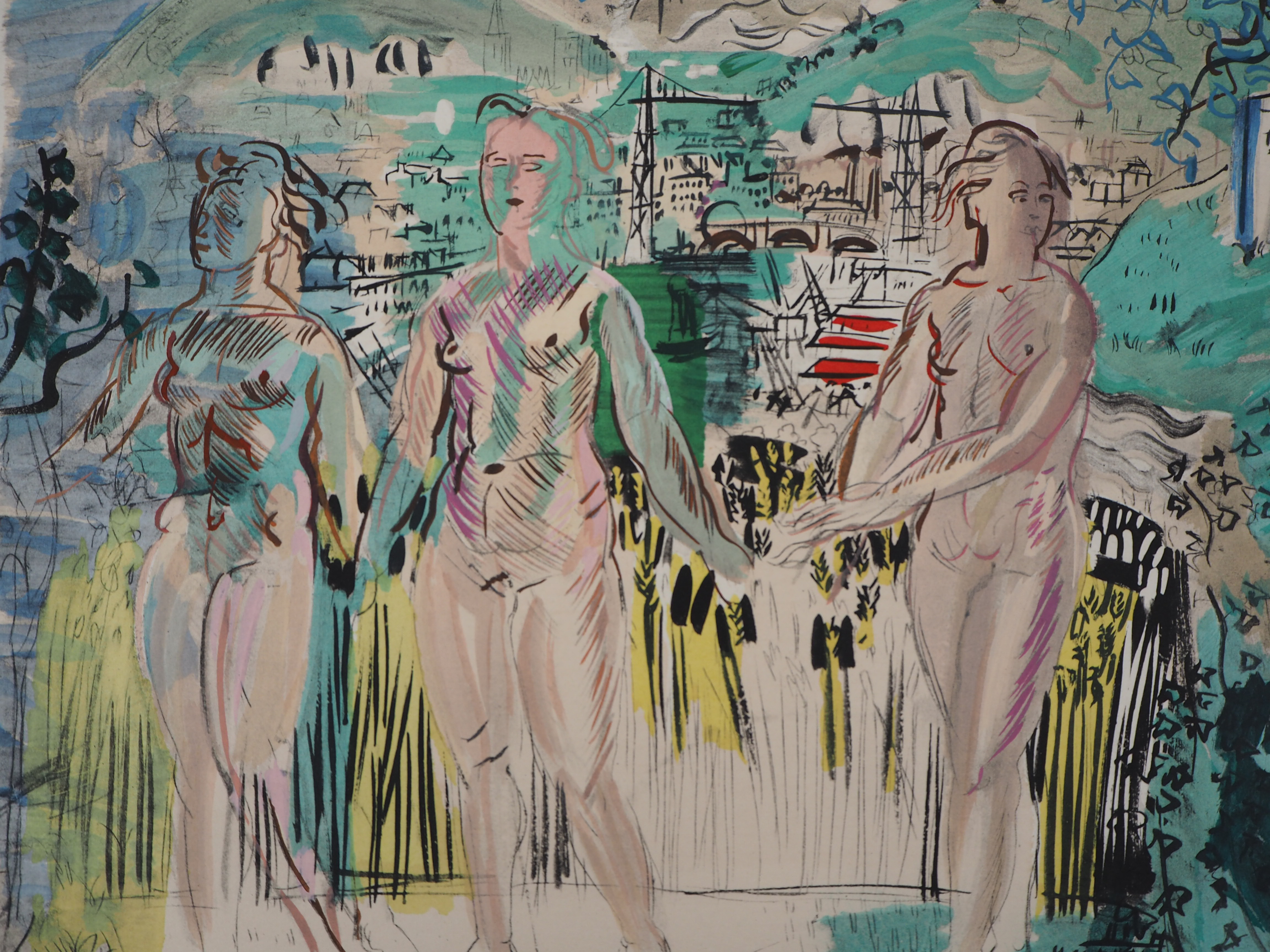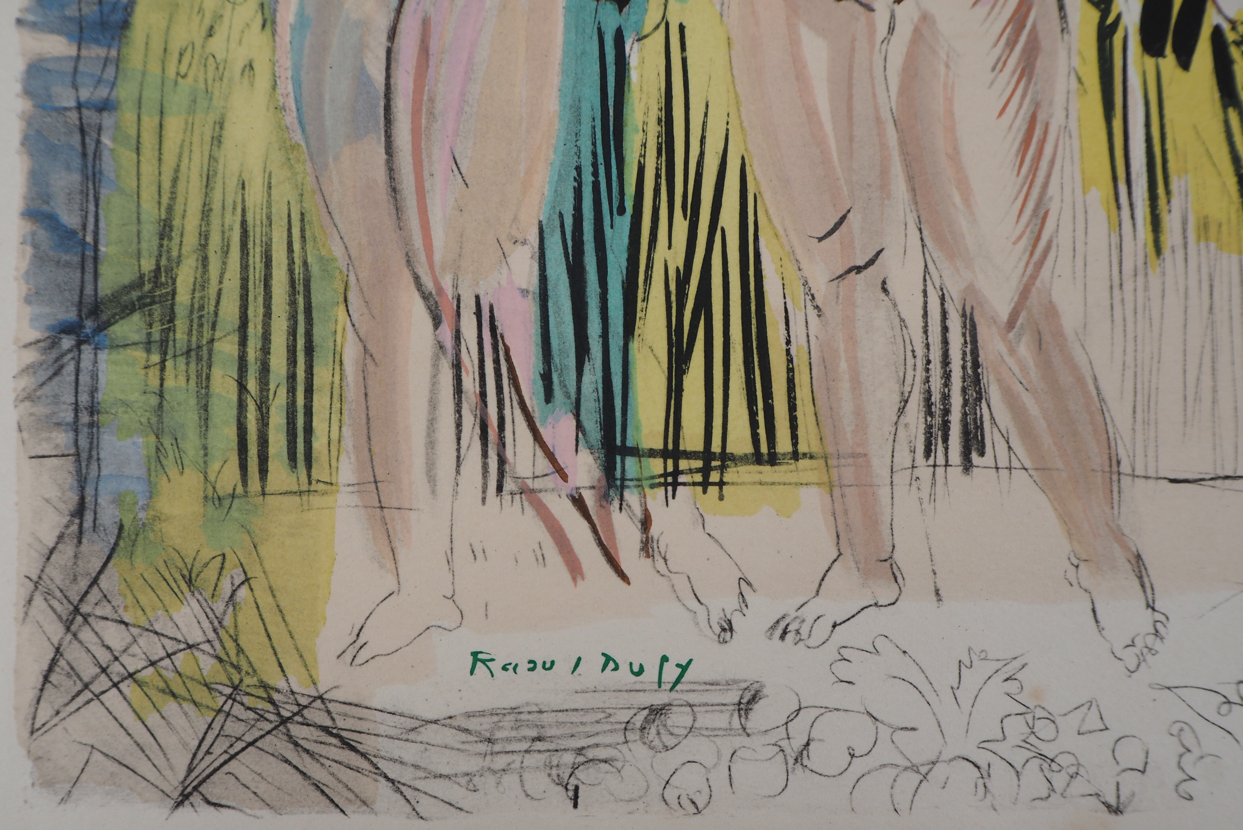Frère de l'artiste Jean Dufy, Raoul naît en 1877 au Havre où il passe son enfance. Etudiant aux Beaux Arts, il travaille à Paris depuis 1900, s’intéressant d'abord aux impressionnistes et aux postimpressionnistes. Dufy travaille avec Albert Marquet à Fécamp, Trouville et au Havre. L'année 1905 marque pour lui une évolution vers une peinture nouvelle. La découverte de l'oeuvre de Matisse "Luxe, calme et volupté" (1904) apparaît comme la révélation de sa rupture avec l'impressionnisme ("Jeanne dans les fleurs", 1907). Vers 1909, son art s'allège, s'empreint de grâce et d'humour ("Le bois de Boulogne", 1909). L'artiste s'affirme également dans l'illustration d'ouvrages comme "Bestiaire d'Orphée" d'Apollinaire en 1910. Il s'intéresse également à l'art décoratif et fonde une entreprise de décoration textile avec Paul Poiret en 1911. Après la première Guerre Mondiale, sa peinture s'épanouit dans son style définitif, marquée par un dessin vif, des couleurs pures au contour arbitraire, représentant généralement un fourmillement de personnages sur des aplats de couleurs vives ("Course à Epson", 1935). Après la guerre l'artiste pratique de plus en plus l'aquarelle et la fin de sa vie tend vers un plus grand dépouillement ("Le violon rouge", 1948). En 1952, Dufy remporte le Grand Prix International de Peinture à la XXVIème Biennale de Venise, il meurt l'année suivante.