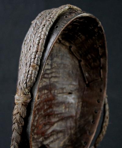 La pièce dispose d'une coiffe traditionnelle constituée de fibres végétales tressées, ainsi que de fines scarifications ethniques au niveau des joues.