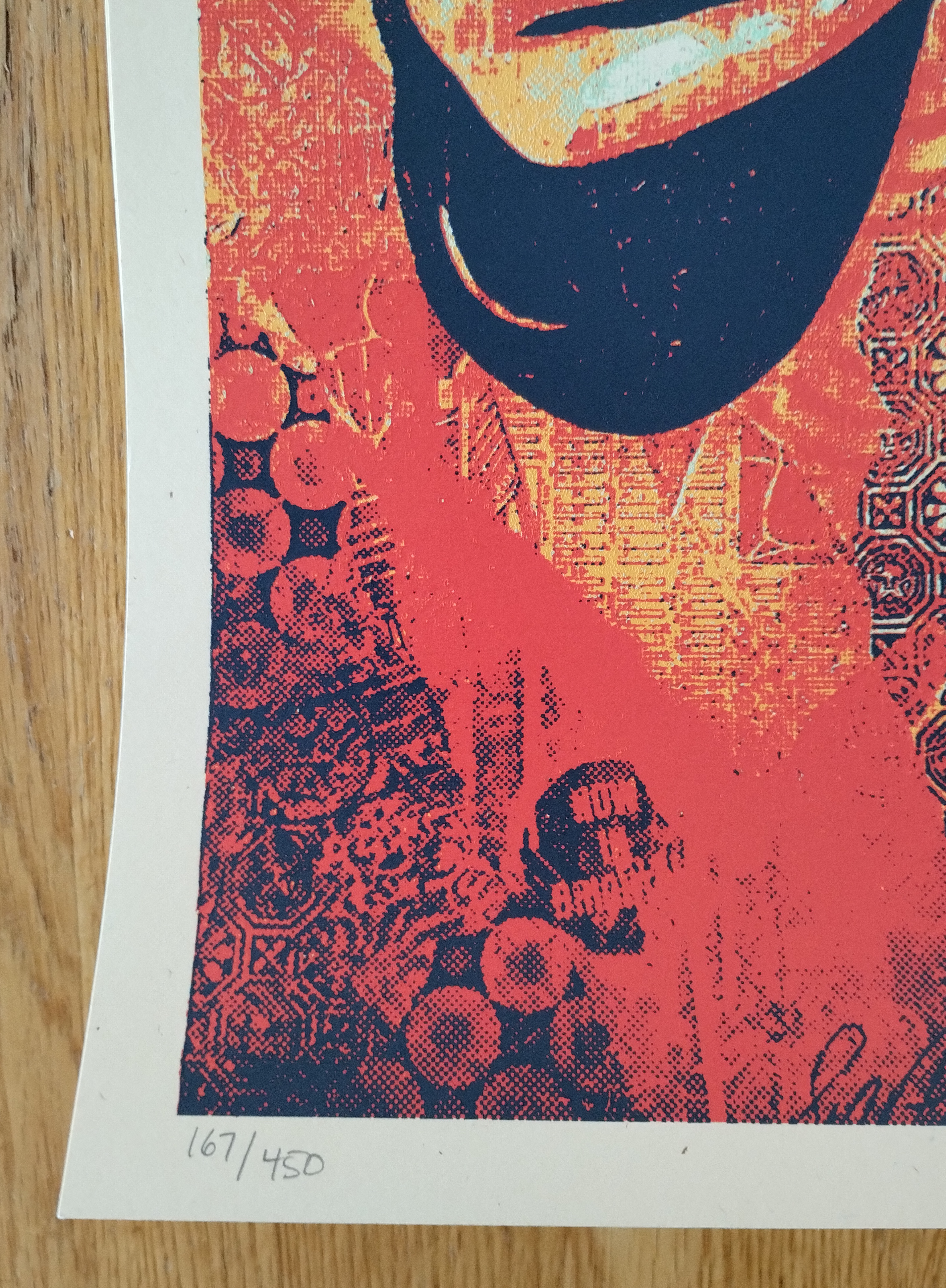 (1970) de son vrai nom Frank Shepard Fairey, est un sérigraphiste, muraliste et illustrateur américain. Dès son plus jeune âge, Shepard Fairey s’intéresse à l’art, étudie l’illustration et réalise des t-shirts et skateboards. Il fonde sa propre entreprise qu’il nomme Alternate Graphics. L’autocollant «André the Giant Has a Posse » servira à Shepard Fairey lors de la campagne Obey Giant, aujourd’hui mondialement connue. Shepard Fairey est influencé par Andy Warhol, Alexander Rodtchenko, Barbara Kruger, Robbie Conal et Diego Rivera. Il travaille pour des groupes tels que Black Eyed Peas, Led Zepplin, The Smashing Pumpkins et bien d’autres. Il se fait réellement connaitre lors de la campagne présidentielle de 2008, lorsqu’il crée des affiches en soutient à Barack Obama, alimentée des inscriptions « HOPE », « CHANGE » ou « VOTE ». Le magazine Time commande le portrait, et fait de Shepard Fairey leur « personnalité de l’année ». Ses œuvres sont visibles au Los Angeles Country Museum of Art, au Musée d'Art Moderne de New York, ou au Victoria and Albert Museum de Londres, mais aussi dans les rues du monde entier. En 2015, il apporte son soutien aux victimes du 13 septembres 2015 en réalisant une Marianne, entourée de la devise Liberté, Egalité, Fraternité.