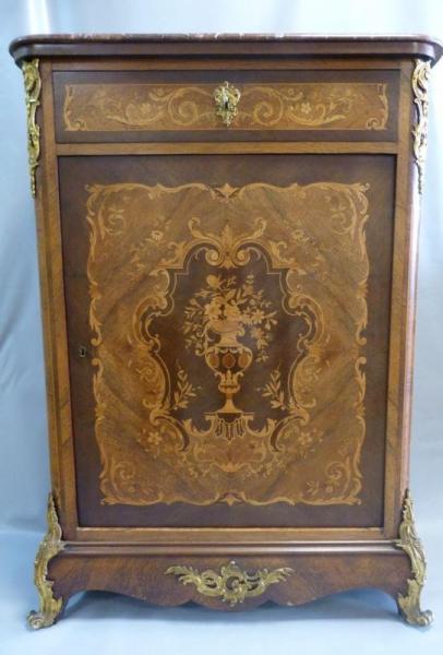 Meuble d’entre-deux à hauteur d’appui à riche décor marqueté d’une urne et de fleurs, ouvrant à une porte.
