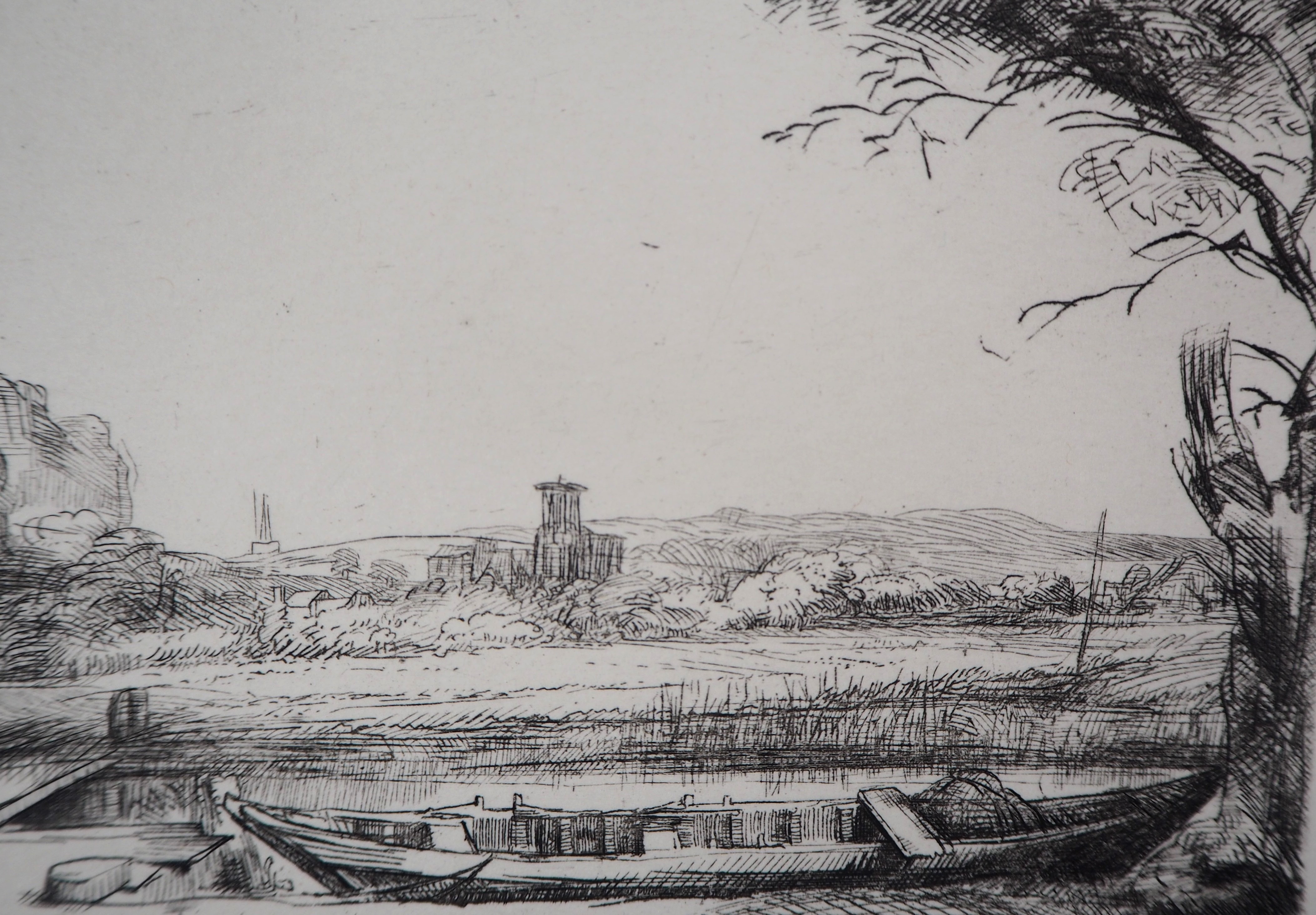 REMBRANDT (d’après) : Paysage au bateau, 1650 - Gravure Signée