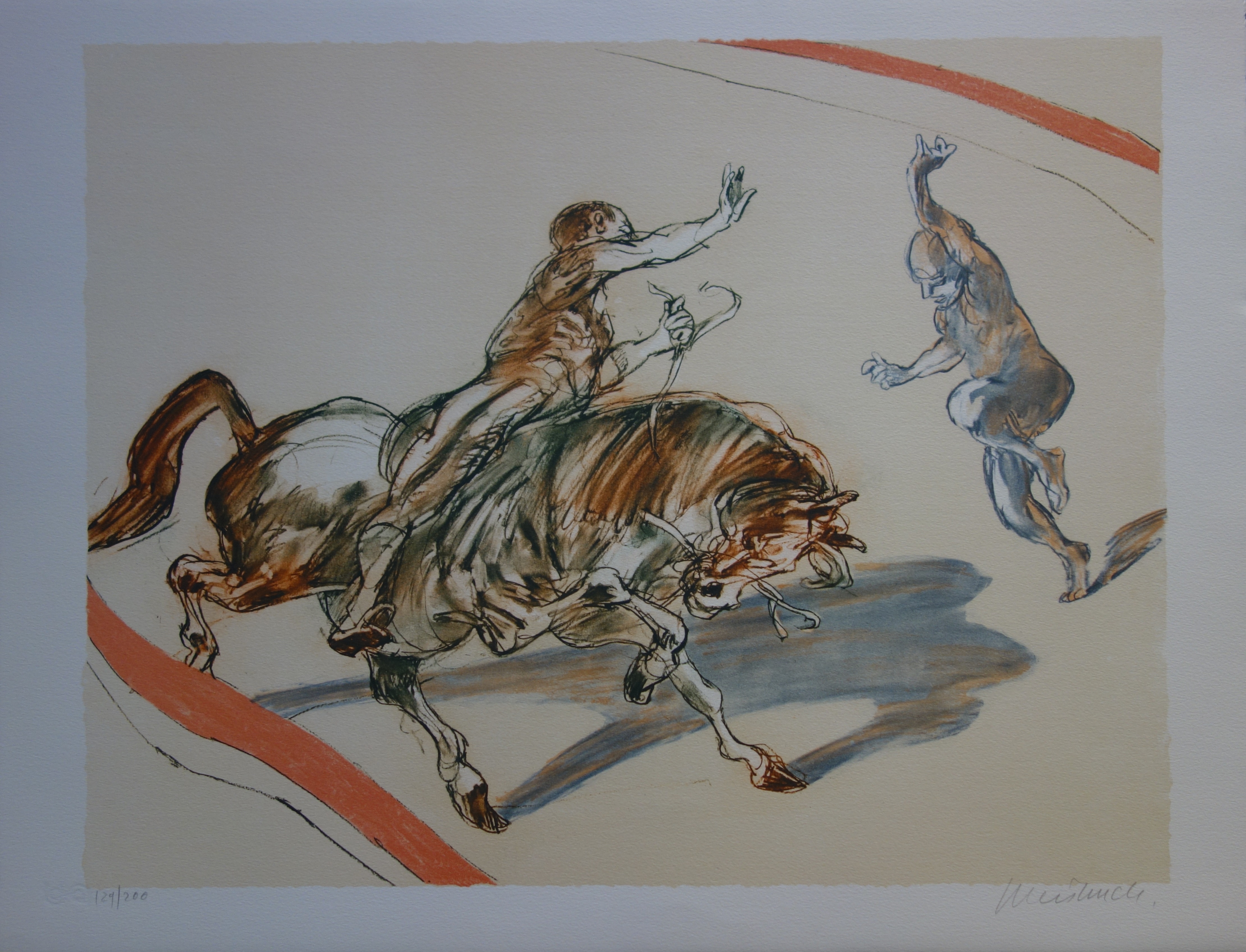 (1927-2014) est un peintre, dessinateur et graveur français. Il fait ses études aux Beaux-Arts de Nancy, puis devient professeur de gravure aux Beaux-Arts de Saint-Etienne. Ce n’est que dans les années 60 qu’il commence à se faire connaître, et devient membre en 1968, de la Société des peintres-graveurs français. Ses œuvres sont dotées de beaucoup de mouvement, voir d’une certaine vitesse, grâce aux traits multiples et à la vivacité avec laquelle il les dessine. Les personnages de Claude Weisbuch sont à la fois des musiciens, des cavaliers, des artistes, des danseurs, et sont la plupart du temps, seuls au milieu de la toile, réalisant avec passion leur art.