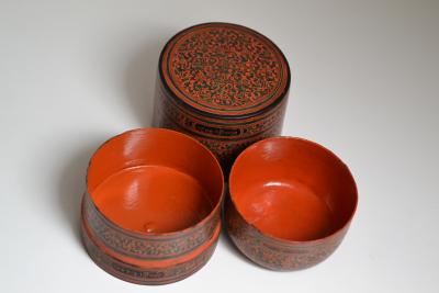 Myanmar, boite et bol en laque polychrome, a décor végétal, debut du 20ème siècle, région de Bagan.