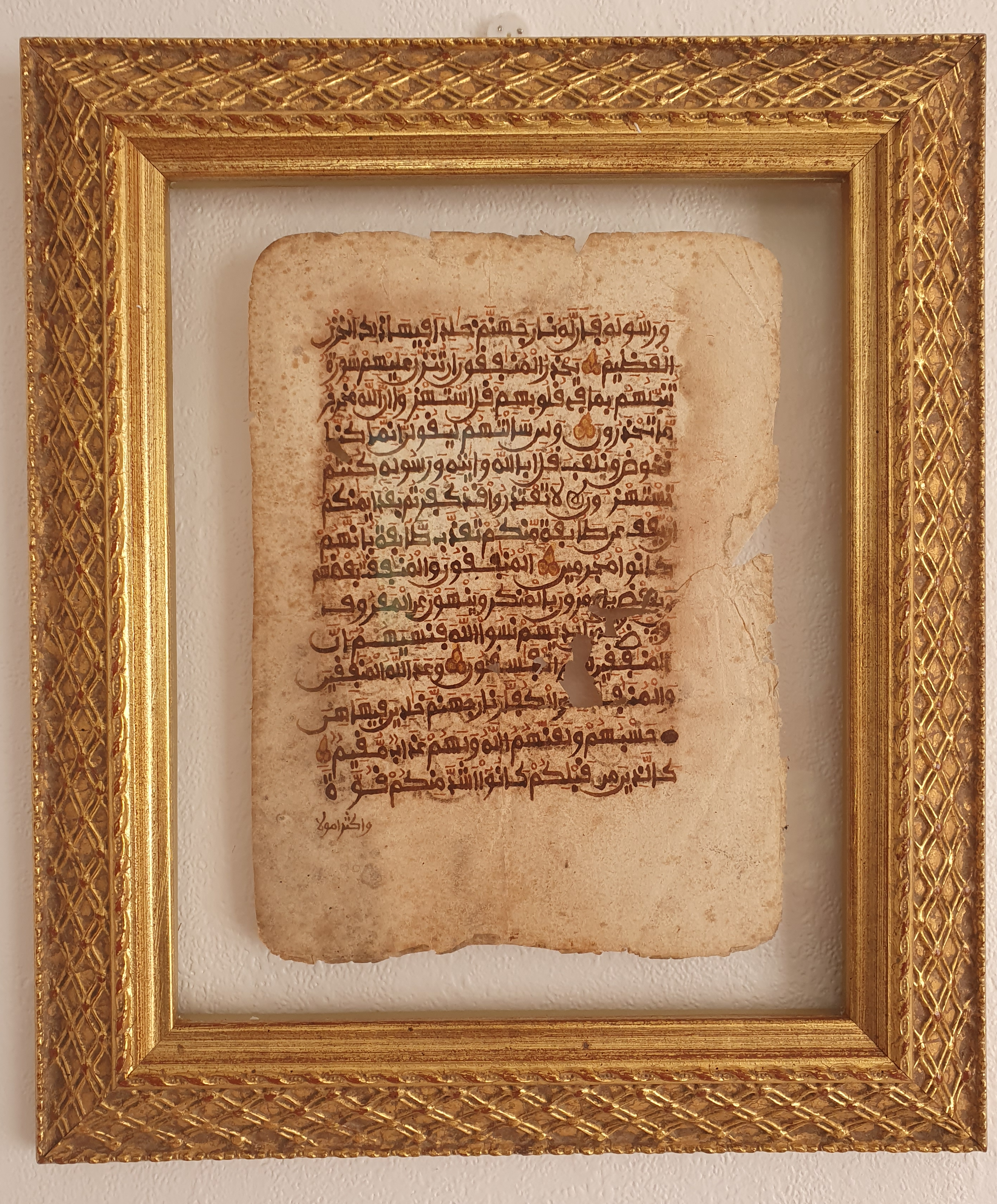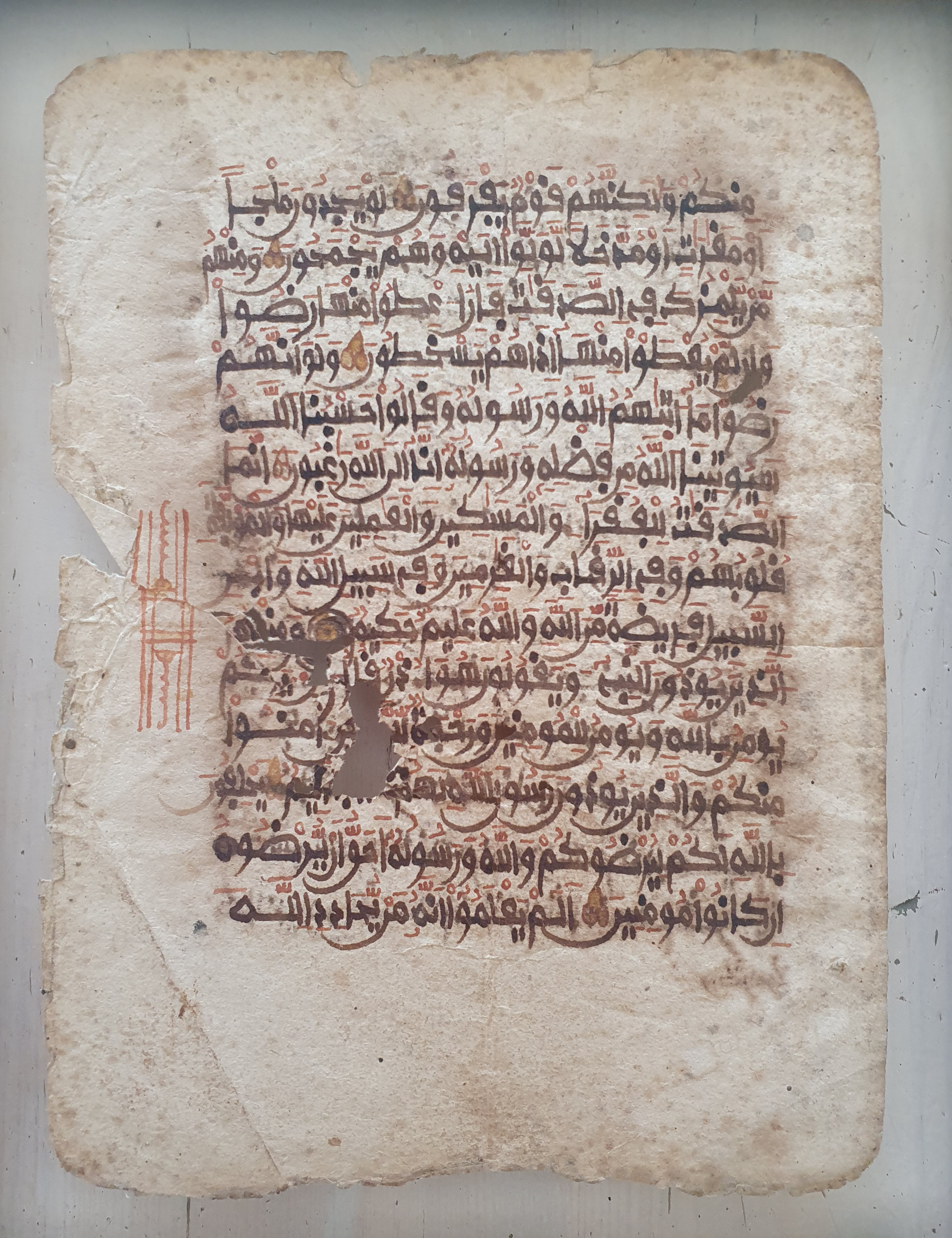 rédigés en calligraphie maghrébine (style caractéristique de l'Afrique du Nord et d'Al-Andalus), à l'encre sépia avec séparations de versets en rouge/orangé.