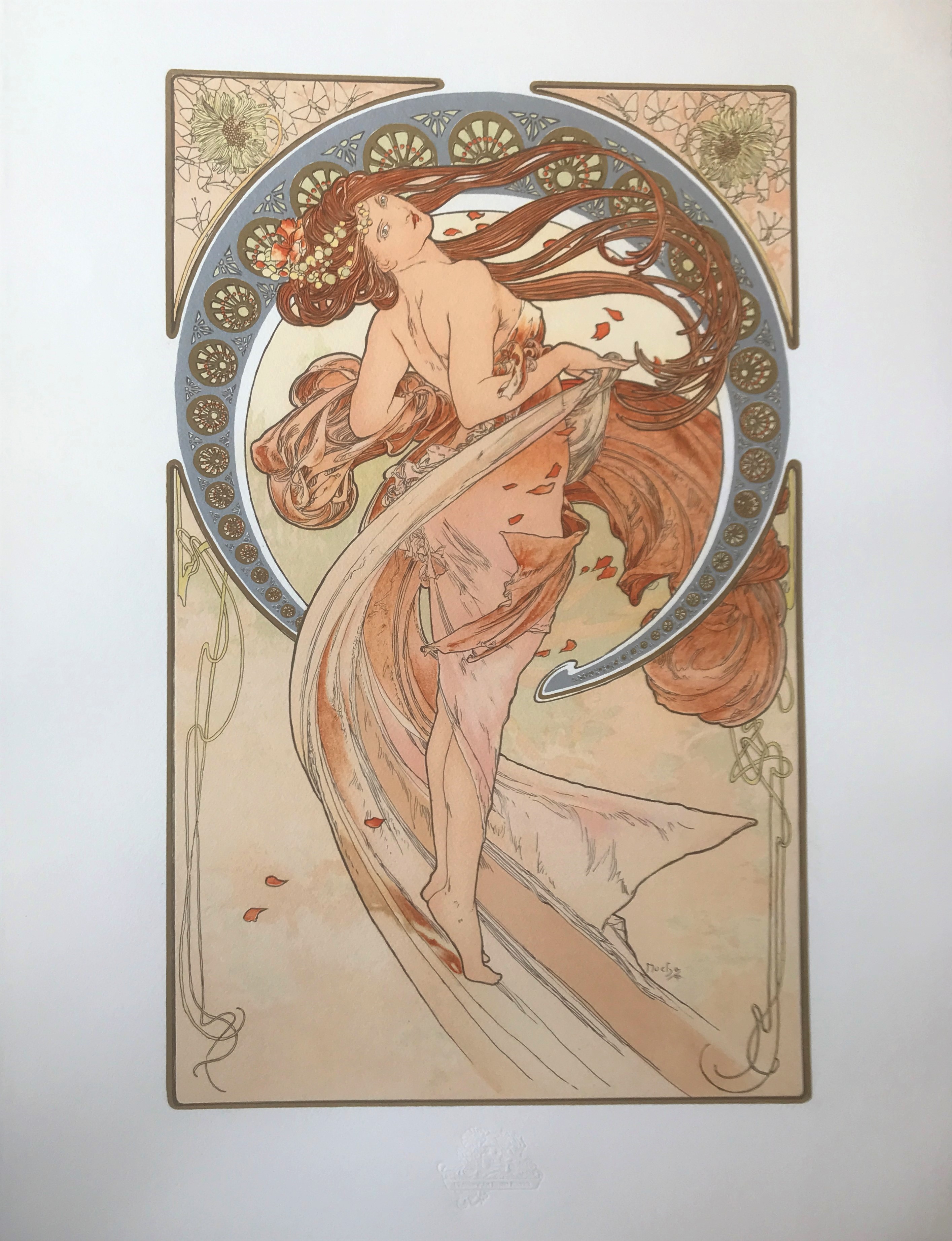 (1860-1939) est un affichiste, illustrateur, peintre et architecte d’intérieur tchèque. Il est aujourd’hui considéré comme l’un des pionniers de l’Art Nouveau. Enfant, il est d’abord orienté par le chant, mais peint déjà quelques toiles, de nos jours très recherchées. Il est refusé des Beaux-Arts de Prague en 1878, ce qui ne sera pas suffisant pour le décourager. Mucha séjourne et travaille à Vienne, dans la plus grande entreprise de décors de théâtre, réalise des portraits en indépendant (le plus souvent de femmes qu’il photographie au préalable), entre à l’Académie de Munich, puis se rend à Paris, où sa carrière d’affichiste débute.