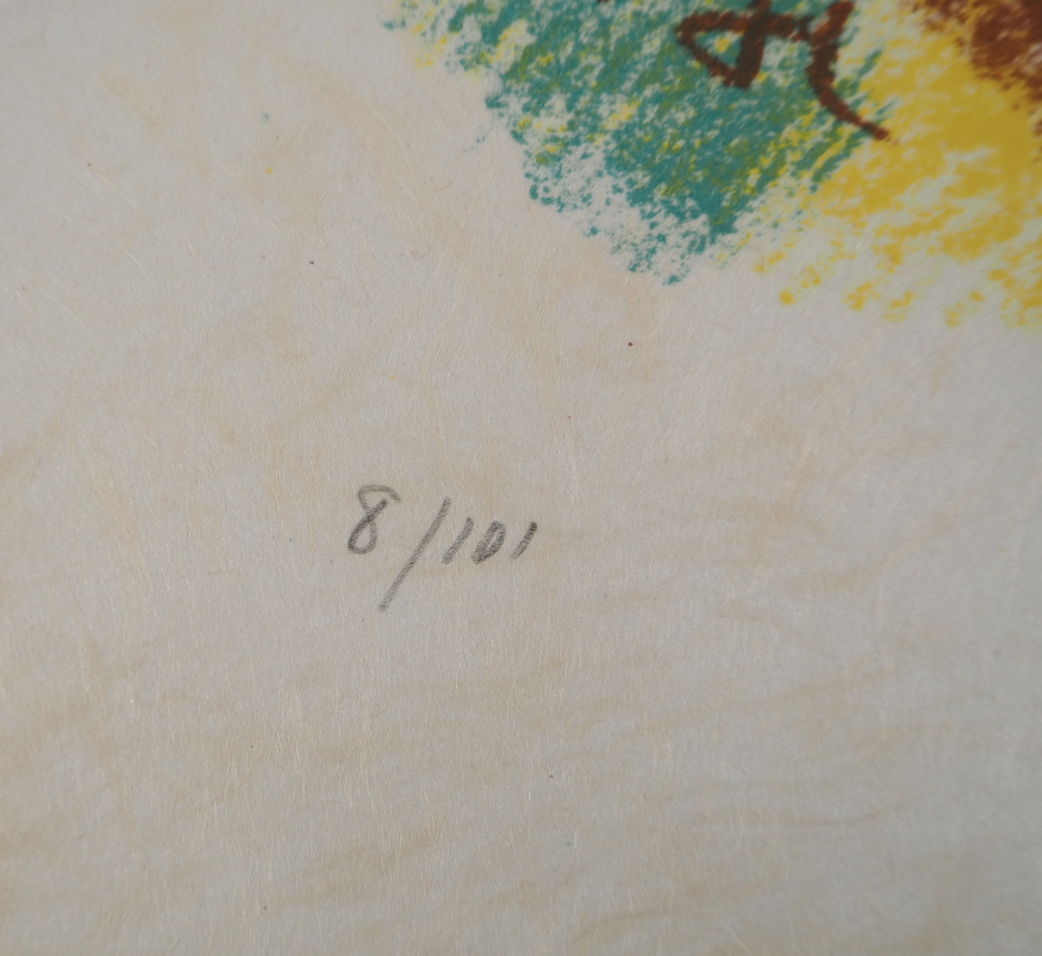 La lithographie tire son nom du grec lithos «pierre» et graphein, «écrire». Il s'agit d'une technique d’impression qui permet la création et la reproduction d'oeuvres graphiques en plusieurs exemplaires à partir de dessins reproduits sur une pierre calcaire. Le papier est mis en contact des pierres encrées dans une presse. Les lithographies peuvent être numérotées ou non. Des grands ateliers, comme Maeght ou Mourlot, maitres dans cette technique, et spécialisé dans cette technique on produit des lithographies des plus grands maîtres, très recherchées aujourd'hui