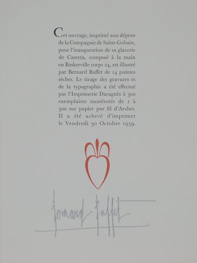 (1928 - 1999) est un peintre et lithographe expressionniste français célèbre. Issu d'un milieu cultivé de la petite bourgeoisie, ses deux grands-pères sont militaires, l'un est passionné de dessin, et son père est directeur d’une miroiterie. Très jeune, Bernard Buffet se passionne donc pour le dessin et la peinture. Il côtoie l’artiste Marie Thérèse Auffray qui lui enseigne la peinture et deviendra son mentor. En 1942, il suit des cours de dessin dans les cours du soir de la ville de Paris. En 1943, il remporte le concours d’entrée à l’Ecole nationale supérieure des baux-arts. A cette époque, il pratique la peinture dans l’atelier d’Eugène Narbonne. En 1945, il perd sa mère d’une tumeur au cerveau. Cet événement tragique le bouleverse et il ne se remettra jamais vraiment. En 1946, il expose sa première œuvre, un autoportrait au salon des moins de trente ans à la galerie des beaux-arts. En 1947, il expose L'Homme accoudé au Salon des indépendants qui va le révéler véritablement au grand public. L'État, par l'intermédiaire de Raymond Cogniat, lui fait son premier achat pour le Musée Nationale de la ville de Paris, la peinture Nature morte au poulet. Dans les années 50, il fait la rencontre de Pierre Bergé avec qui il nouera une relation. En 1958, il fait la connaissance de Annabel Schwob à Saint-Tropez et tombe éperdument amoureux. C’est la fin de sa relation avec Pierre Bergé qui gérait aussi sa carrière. Buffet épouse Annabel SchwobIl la même année. Il est élu à l’Académie des BeauxArts en 1974, il est le plus jeune académicien à cette époque.