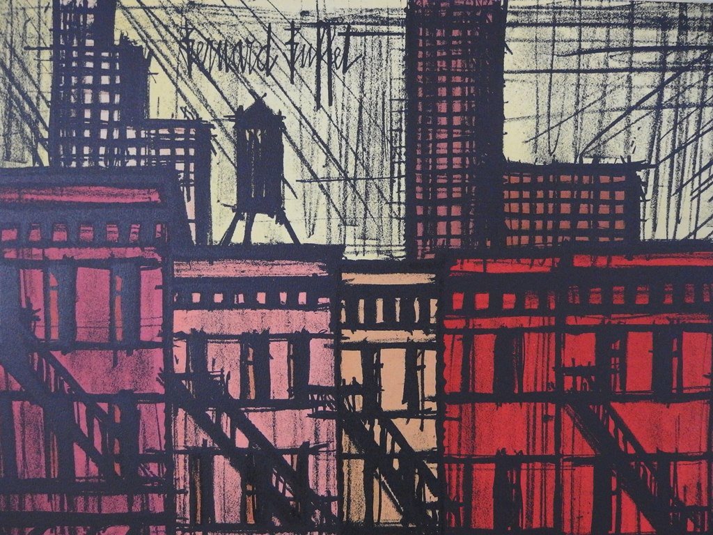 (1928 - 1999) est un peintre et lithographe expressionniste français célèbre. Issu d'un milieu cultivé de la petite bourgeoisie, ses deux grands-pères sont militaires, l'un est passionné de dessin, et son père est directeur d’une miroiterie. Très jeune, Bernard Buffet se passionne donc pour le dessin et la peinture. Il côtoie l’artiste Marie Thérèse Auffray qui lui enseigne la peinture et deviendra son mentor. En 1942, il suit des cours de dessin dans les cours du soir de la ville de Paris. En 1943, il remporte le concours d’entrée à l’Ecole nationale supérieure des baux-arts. A cette époque, il pratique la peinture dans l’atelier d’Eugène Narbonne. En 1945, il perd sa mère d’une tumeur au cerveau. Cet événement tragique le bouleverse et il ne se remettra jamais vraiment. En 1946, il expose sa première œuvre, un autoportrait au salon des moins de trente ans à la galerie des beaux-arts. En 1947, il expose L'Homme accoudé au Salon des indépendants qui va le révéler véritablement au grand public. L'État, par l'intermédiaire de Raymond Cogniat, lui fait son premier achat pour le Musée Nationale de la ville de Paris, la peinture Nature morte au poulet. Dans les années 50, il fait la rencontre de Pierre Bergé avec qui il nouera une relation. En 1958, il fait la connaissance de Annabel Schwob à Saint-Tropez et tombe éperdument amoureux. C’est la fin de sa relation avec Pierre Bergé qui gérait aussi sa carrière. Buffet épouse Annabel SchwobIl la même année. Il est élu à l’Académie des BeauxArts en 1974, il est le plus jeune académicien à cette époque.