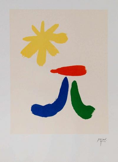 Joan Miró : Peintre et sculpteur espagnol né à Barcelone en 1893, il étudie à l'Ecole des Beaux-Arts de Barcelone dès 1907 et se consacre entièrement à la peinture dès 1912. L'artiste s’affirme à travers différents médiums, peinture, collage, lithographie, eau-forte, céramique, sculpture sur marbre et sur bronze... Miró découvre le cubisme et le fauvisme à Paris où il s'établit en 1920 et se lie avec Pablo Picasso, André Masson et les représentants du dadaïsme, avant d'adhérer au surréalisme. Il achève sa fameuse série de "Constellations" (1940-1941) à Palma de Majorque où il se fixe en 1956. En 1942, l'artiste revient à Barcelone puis aux Etats-Unis cinq ans plus tard et aborde la peinture monumentale ("Composition avec cordes", 1950, Eindhoven). A partir des années 1960, ses peintures manifestent une nouvelle recherche sur l'espace, souvent monochrome ("Bleu I, II, III", 1961, MNAM). Ses derniers travaux sont des statues monumentales pour Chicago (1981), Houston et Barcelone (1982). L'artiste décède à Palma de Majorque en 1983.
