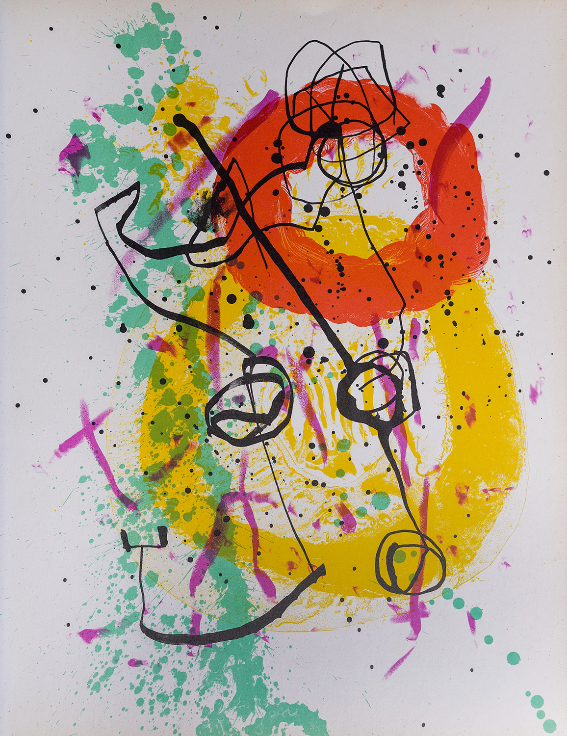 Joan Miró : Peintre et sculpteur espagnol né à Barcelone en 1893, il étudie à l'Ecole des Beaux-Arts de Barcelone dès 1907 et se consacre entièrement à la peinture dès 1912. L'artiste s’affirme à travers différents médiums, peinture, collage, lithographie, eau-forte, céramique, sculpture sur marbre et sur bronze... Miró découvre le cubisme et le fauvisme à Paris où il s'établit en 1920 et se lie avec Pablo Picasso, André Masson et les représentants du dadaïsme, avant d'adhérer au surréalisme. Il achève sa fameuse série de "Constellations" (1940-1941) à Palma de Majorque où il se fixe en 1956. En 1942, l'artiste revient à Barcelone puis aux Etats-Unis cinq ans plus tard et aborde la peinture monumentale ("Composition avec cordes", 1950, Eindhoven). A partir des années 1960, ses peintures manifestent une nouvelle recherche sur l'espace, souvent monochrome ("Bleu I, II, III", 1961, MNAM). Ses derniers travaux sont des statues monumentales pour Chicago (1981), Houston et Barcelone (1982). L'artiste décède à Palma de Majorque en 1983.