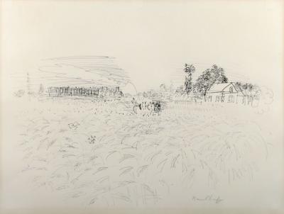 Frère de l'artiste Jean Dufy, Raoul naît en 1877 au Havre où il passe son enfance. Etudiant aux Beaux Arts, il travaille à Paris depuis 1900, s’intéressant d'abord aux impressionnistes et aux postimpressionnistes. Dufy travaille avec Albert Marquet à Fécamp, Trouville et au Havre. L'année 1905 marque pour lui une évolution vers une peinture nouvelle. La découverte de l'oeuvre de Matisse "Luxe, calme et volupté" (1904) apparaît comme la révélation de sa rupture avec l'impressionnisme ("Jeanne dans les fleurs", 1907). Vers 1909, son art s'allège, s'empreint de grâce et d'humour ("Le bois de Boulogne", 1909). L'artiste s'affirme également dans l'illustration d'ouvrages comme "Bestiaire d'Orphée" d'Apollinaire en 1910. Il s'intéresse également à l'art décoratif et fonde une entreprise de décoration textile avec Paul Poiret en 1911. Après la première Guerre Mondiale, sa peinture s'épanouit dans son style définitif, marquée par un dessin vif, des couleurs pures au contour arbitraire, représentant généralement un fourmillement de personnages sur des aplats de couleurs vives ("Course à Epson", 1935). Après la guerre l'artiste pratique de plus en plus l'aquarelle et la fin de sa vie tend vers un plus grand dépouillement ("Le violon rouge", 1948). En 1952, Dufy remporte le Grand Prix International de Peinture à la XXVIème Biennale de Venise, il meurt l'année suivante.